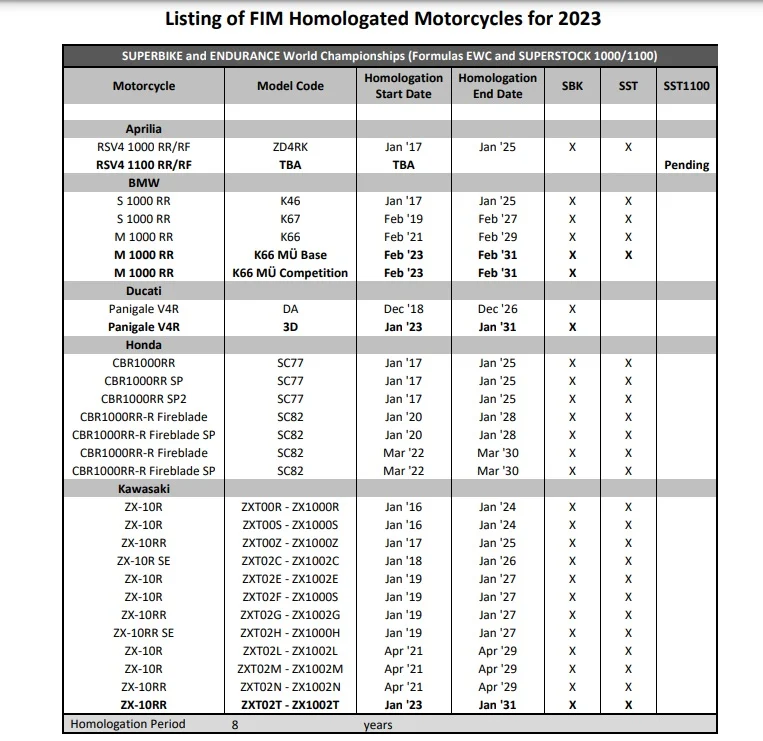 Diramato l'elenco delle moto omolgate per il Mondiale Superbike 2023, diventa concreta la possibilità di richiesta di omologazione di moto da 1.100 cc, ed inevitabilmente si pensa ad un ritorno di Aprilia. Ovviamente la richiesta sarebbe comunque subordinata all'approvazione della FIM. Le moto omologate per il mondiale Superbile 2023 [IMG]https://i.postimg.cc/bdXhx3tP/sbk30.webpfree photo web hosting[/IMG] |