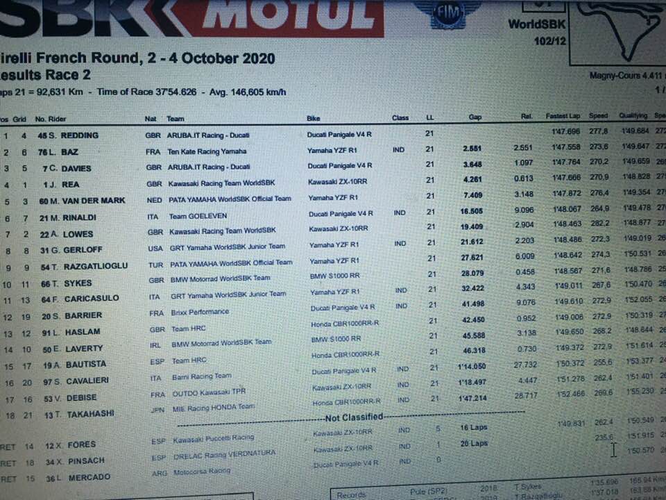 Rea inarrivabile ma comunque grande prova di carattere di Redding che si sta rivelando ben più solido di Bautista. Sorprendente il risultato della Ducati con due moto sul podio in un pista storicamente ostica e col bagnato. Forse il progetto V4 sta finalmente arrivando alla piena maturazione.