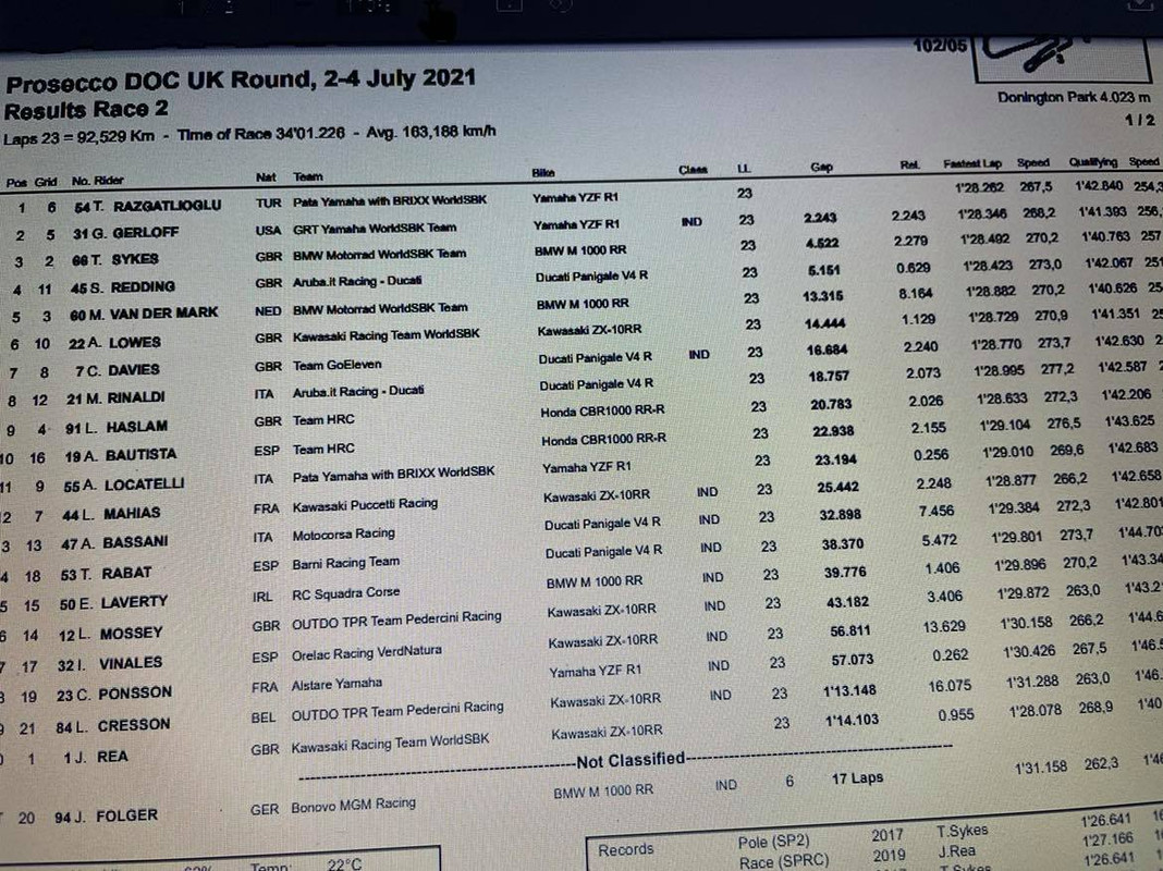 Ordine di arrivo Gara 2 SBK