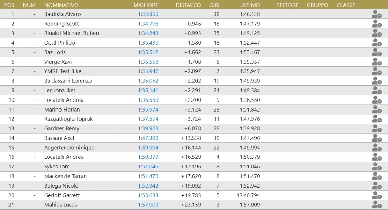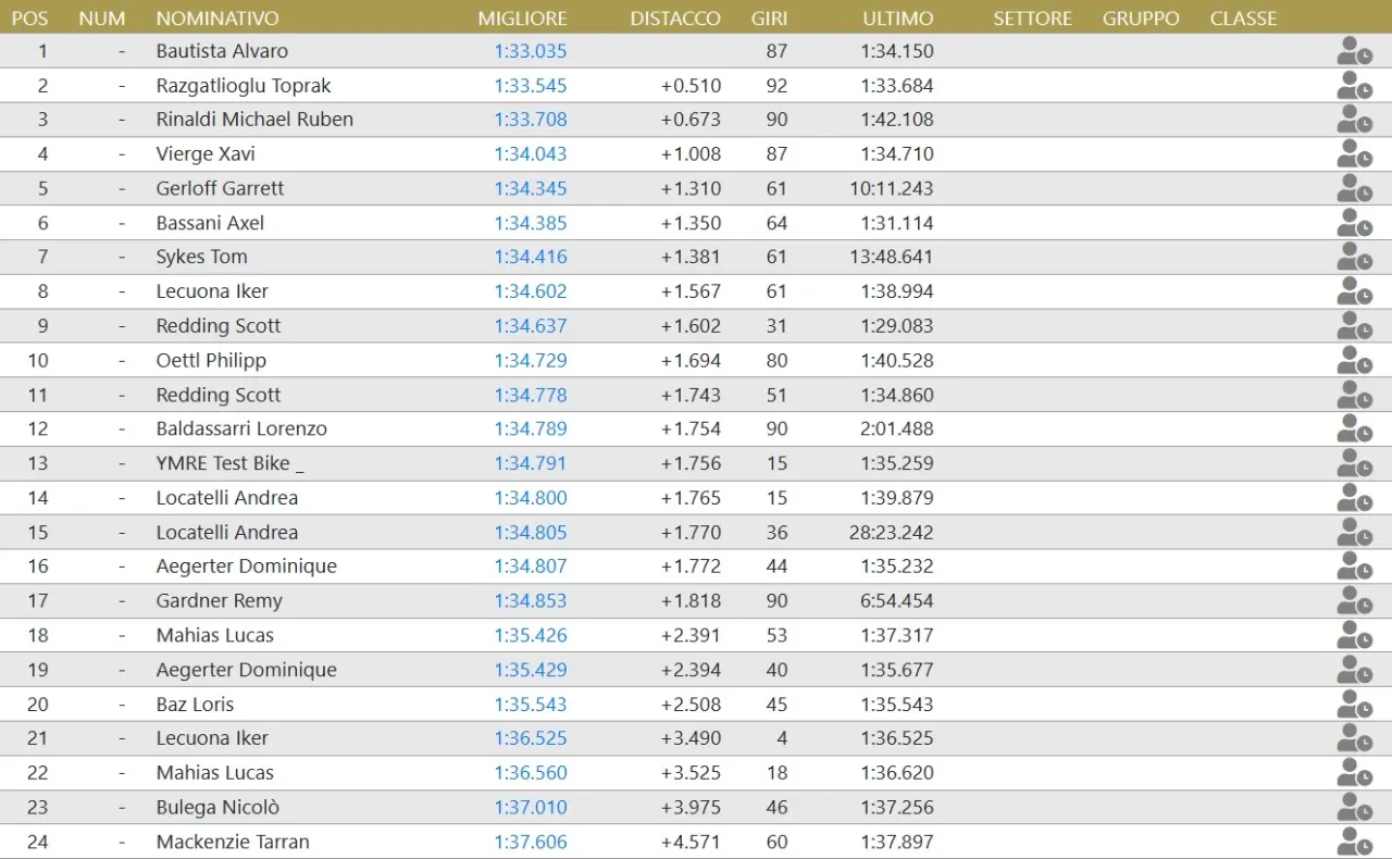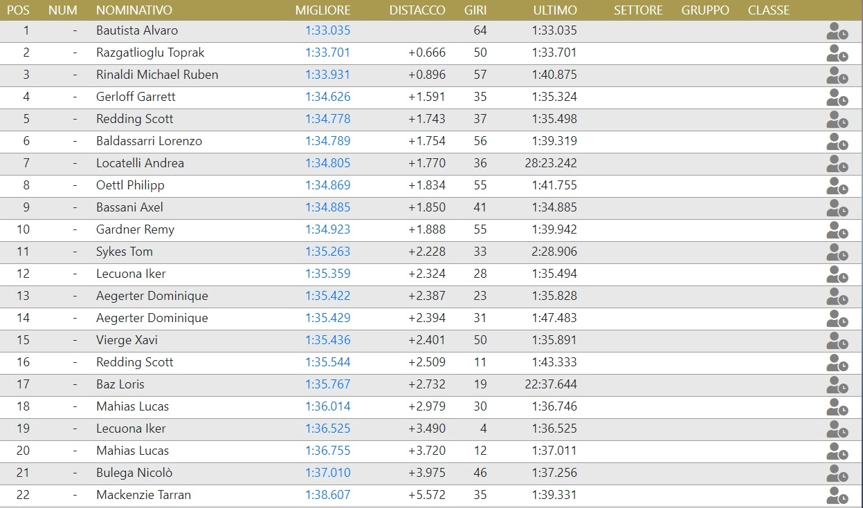 Niente pioggia a Misano e solito show di Bautista che con 1.33.035 sfiora il primato della pista. çrimo dei terrestri è Razgatioglu mentre Rinaldi, terzo, incassa quasi un secondo.