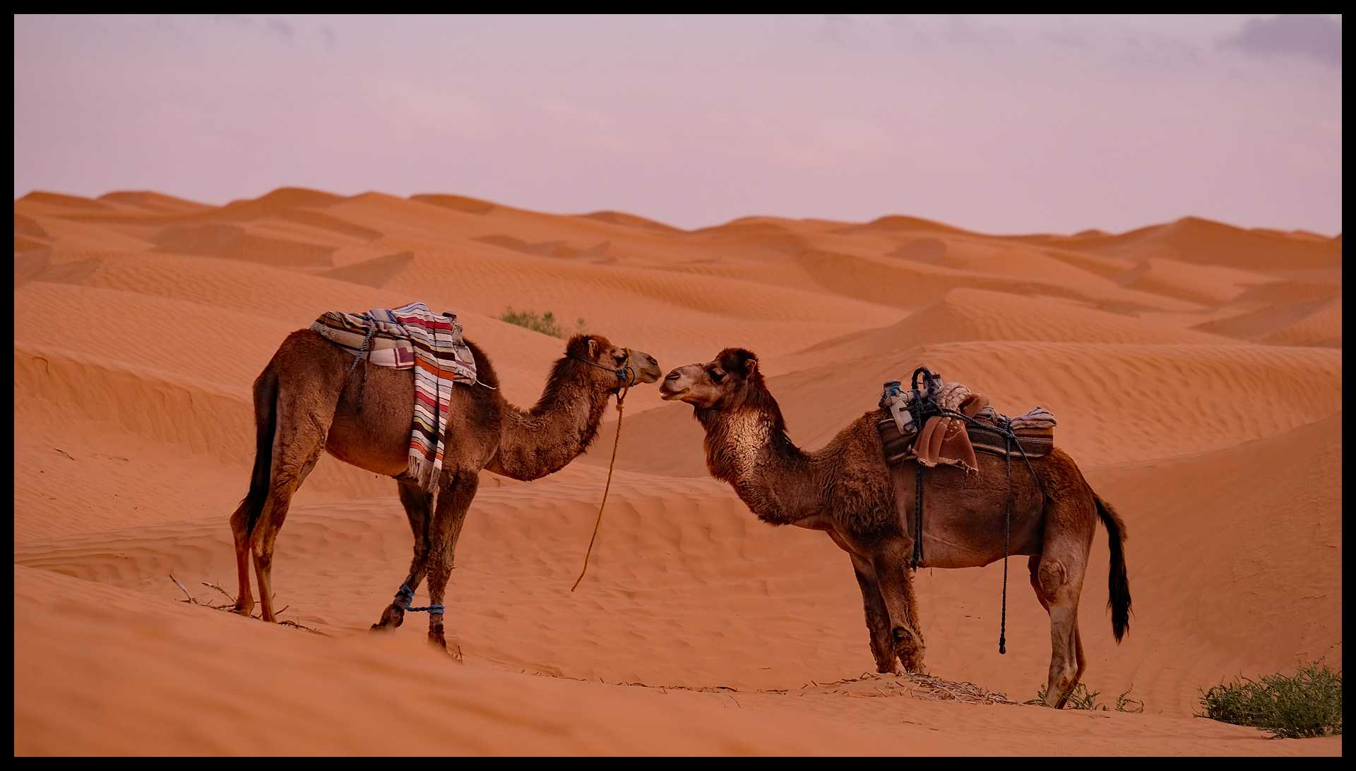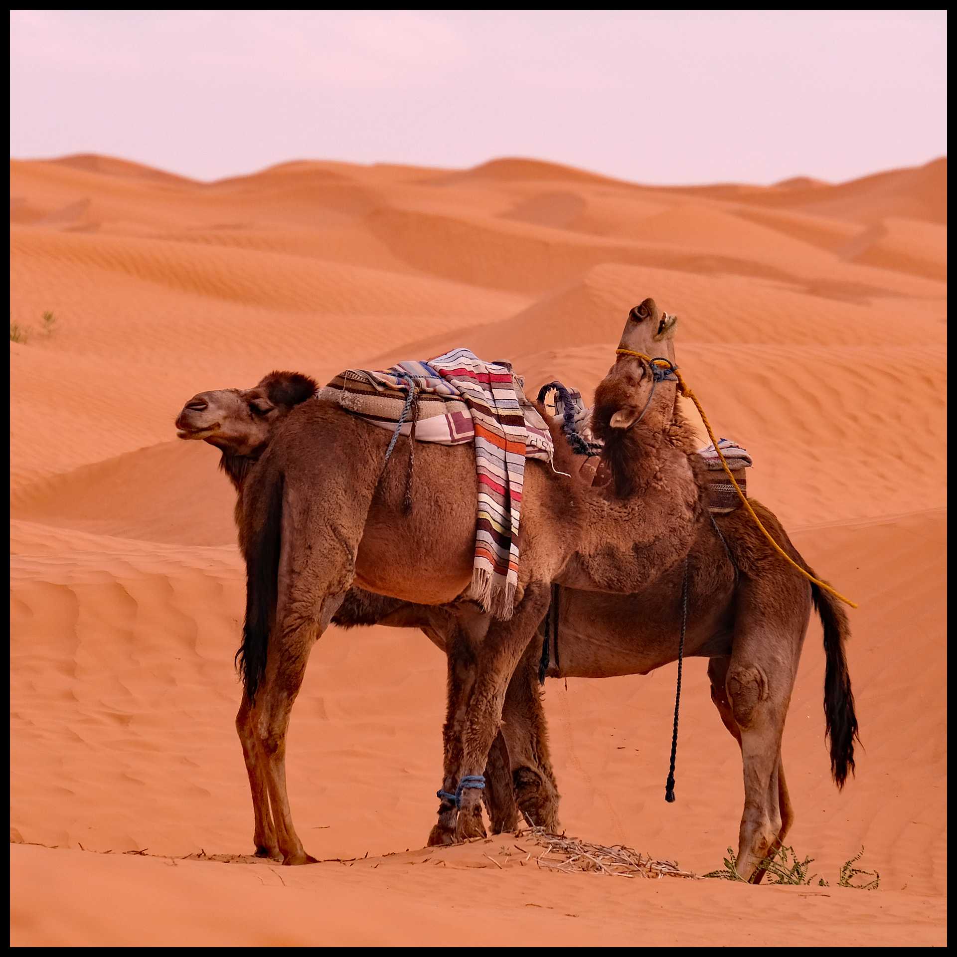 Abbiamo proprio dormito di gusto… Al mattino presto veniamo svegliati da una coppia di dromedari che si sono piazzati a due passi dalla nostra tenda. Fanno dei versi strani, simili a grugniti, a volume bello alto.