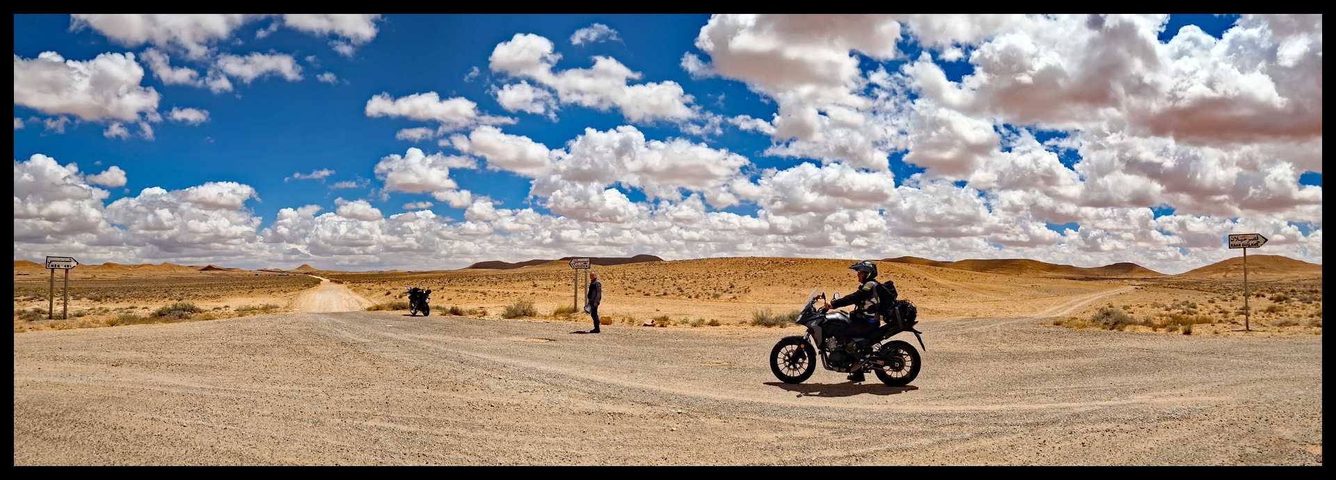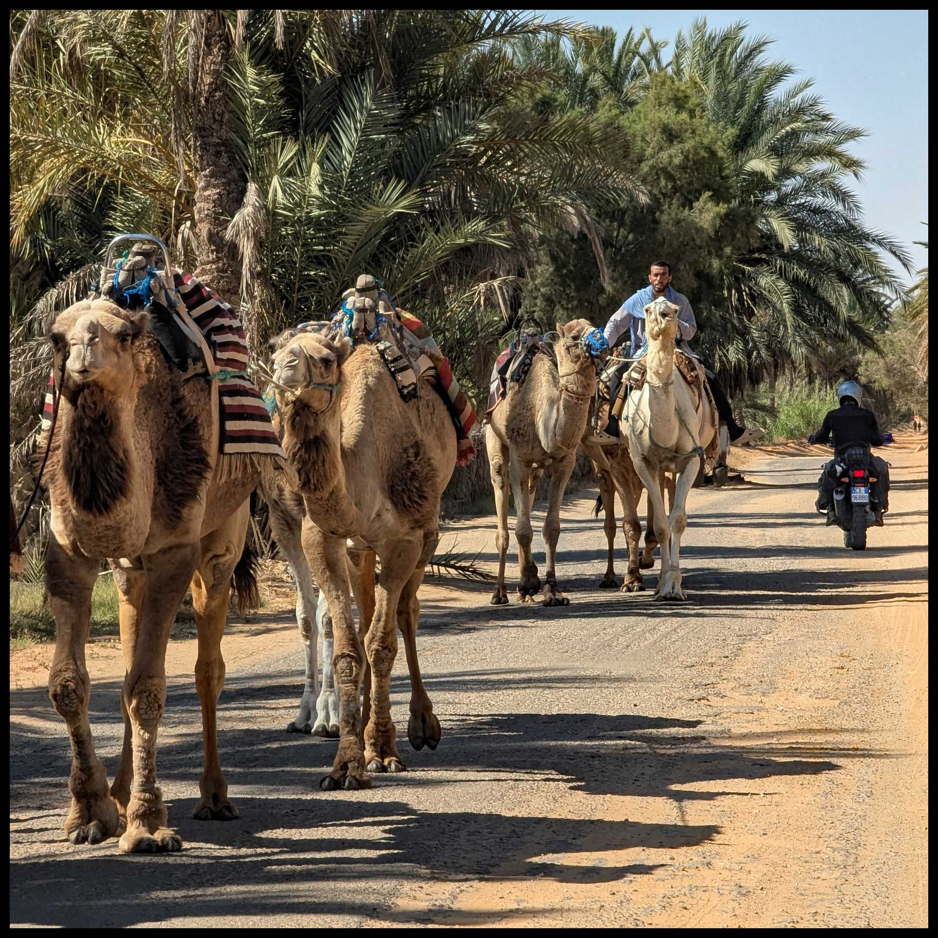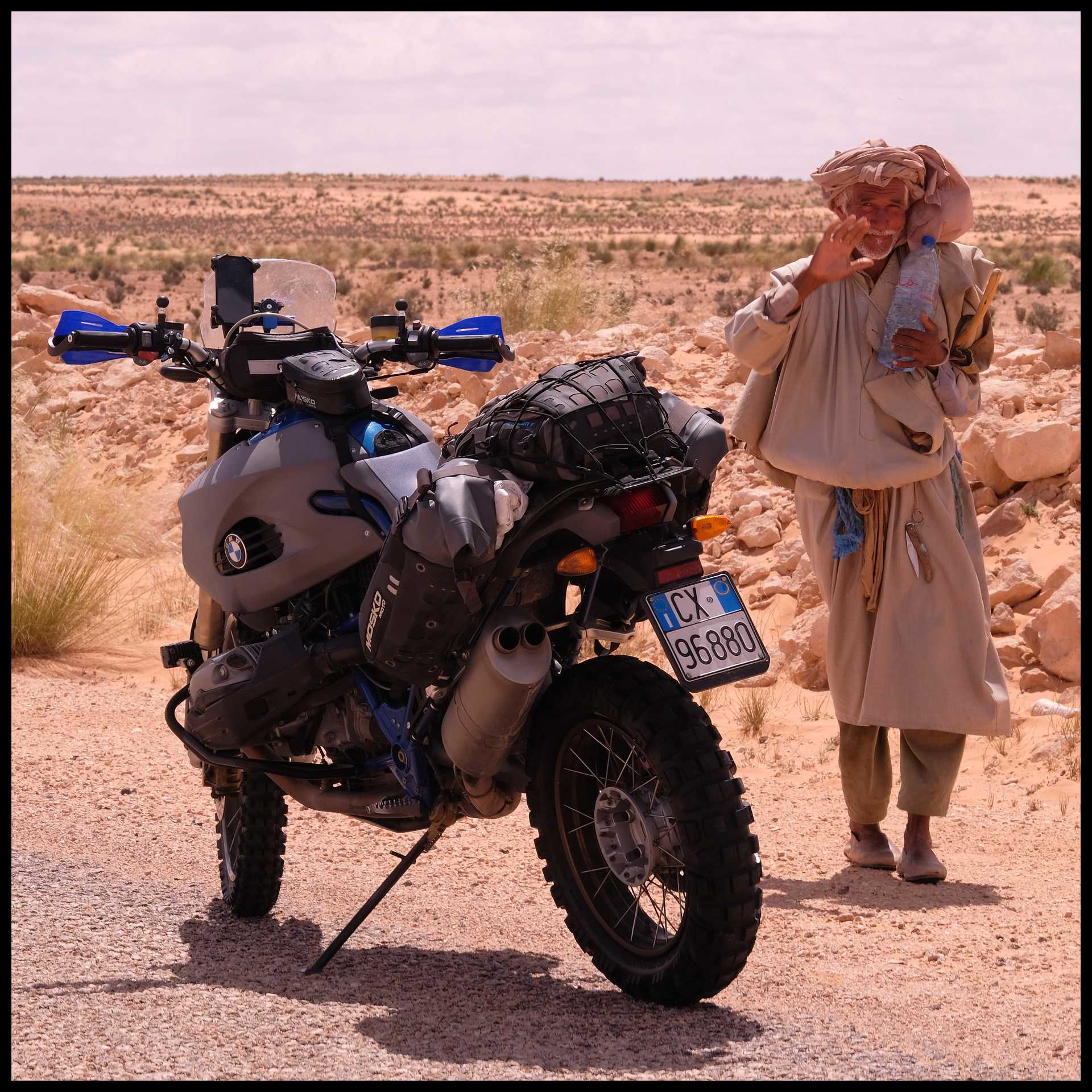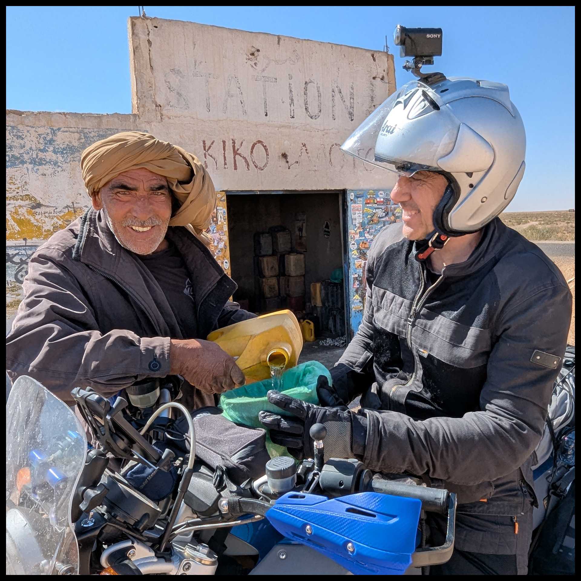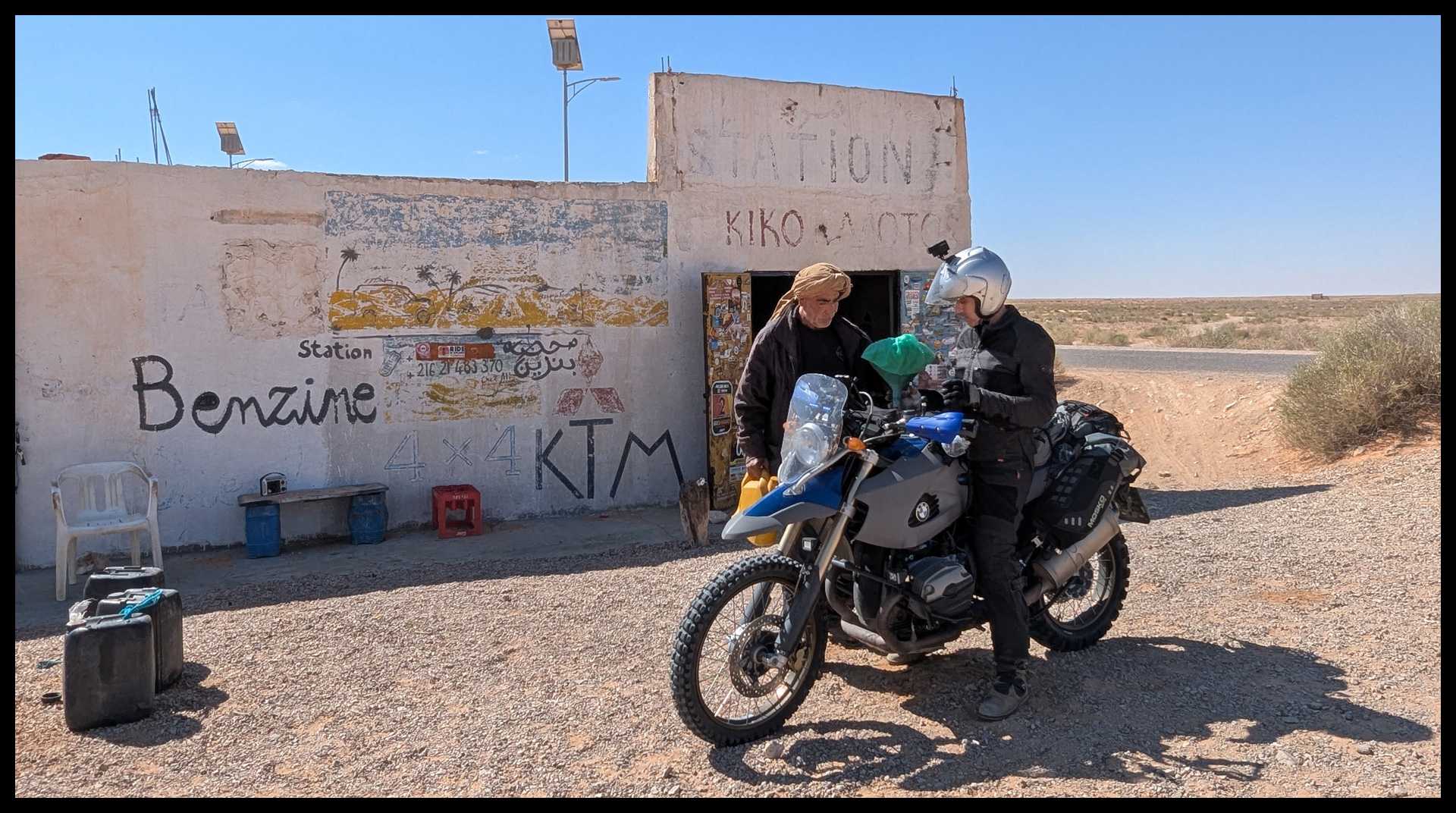Uno di noi è a secco. Troviamo appena fuori l’oasi uno spacciatore di benza. Immagino che sia l’unico, perché nelle foto che ho visto in giro, tutti fanno rifornimento qui. Ha benzina algerina che travasa direttamente nel serbatoio da taniche multicolor. E’ previdente: usa pure la retina.