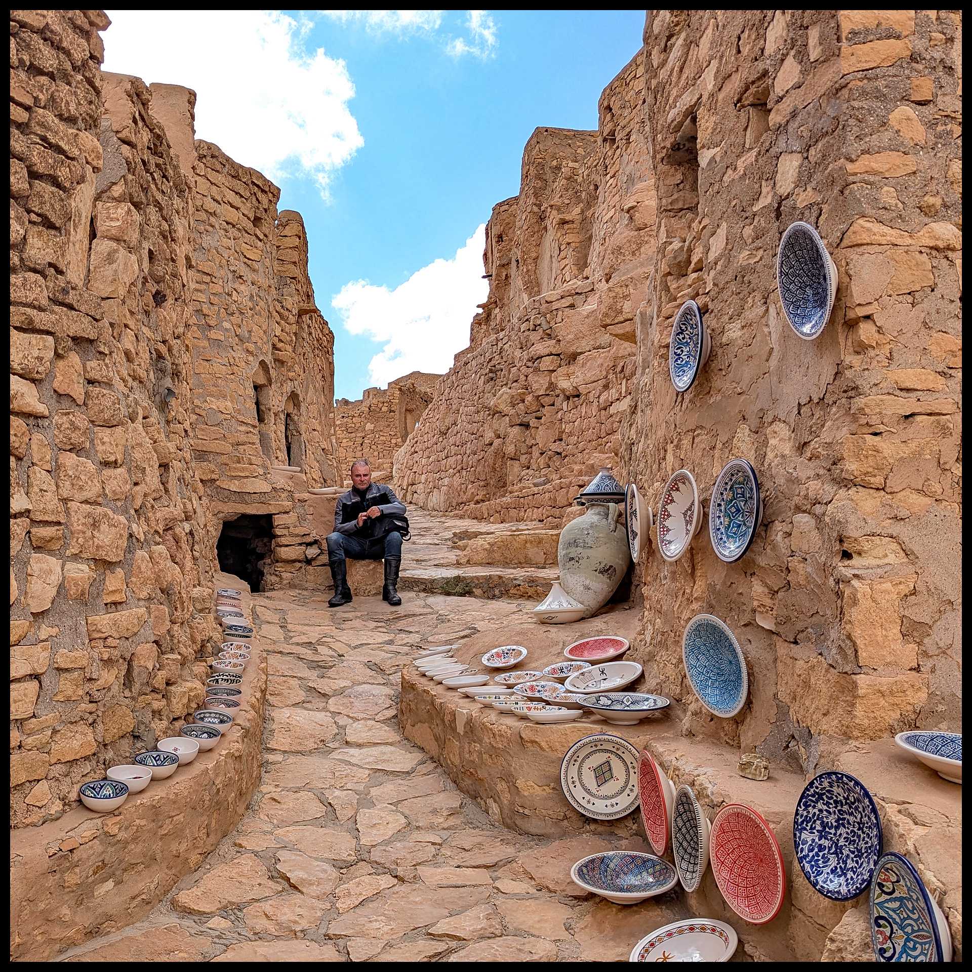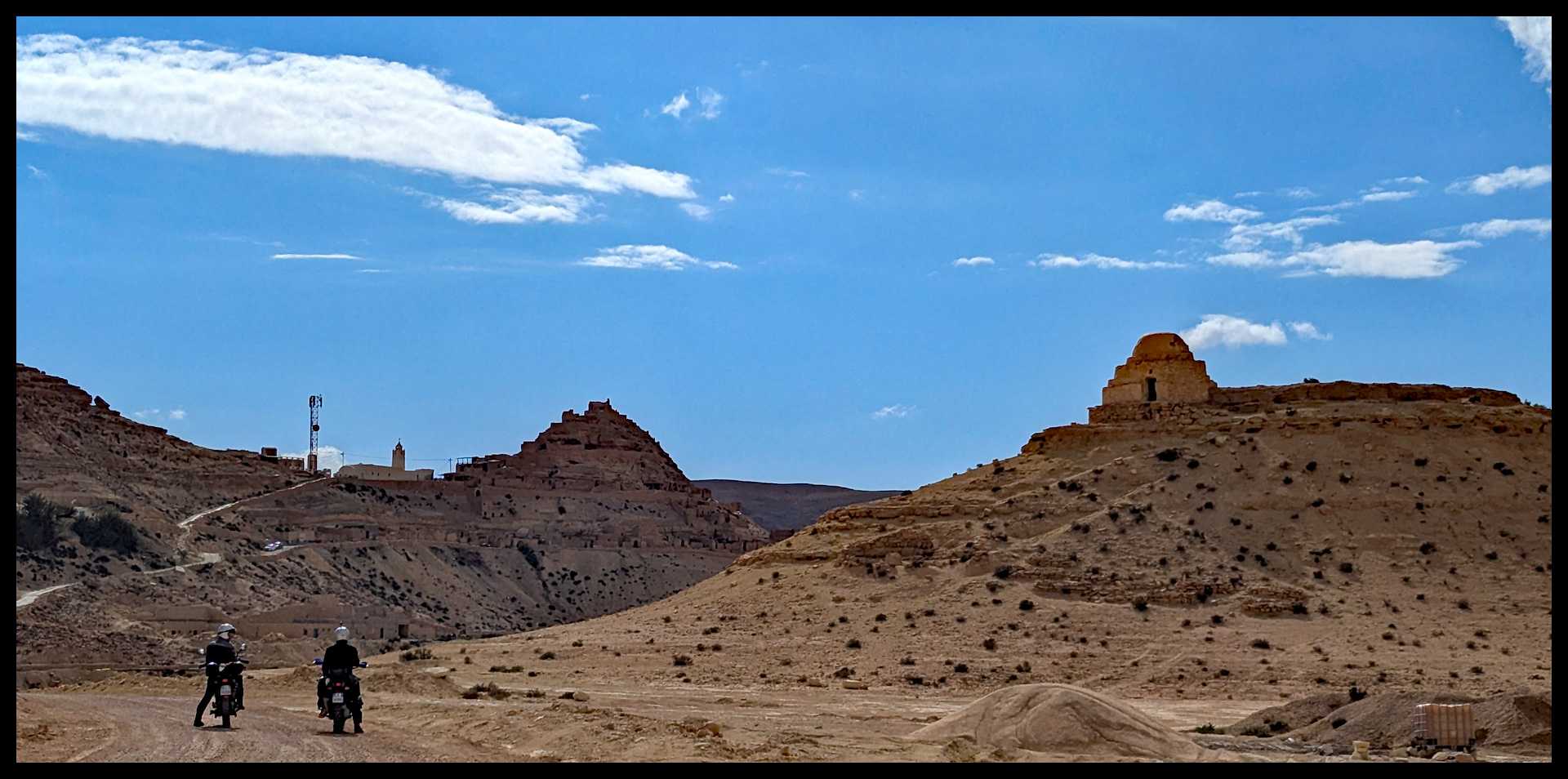 Quando arriviamo non c’è nessuno. Solo un gruppo di ragazzi se ne sta in disparte nell’unico baretto vicino alla candida moschea. L’atmosfera è quasi surreale, complice anche la luce straordinaria. Entriamo in moto per l’unica sterrata che costeggia sul lato sud tutto il villaggio, proprio alla base delle abitazioni rupestri.