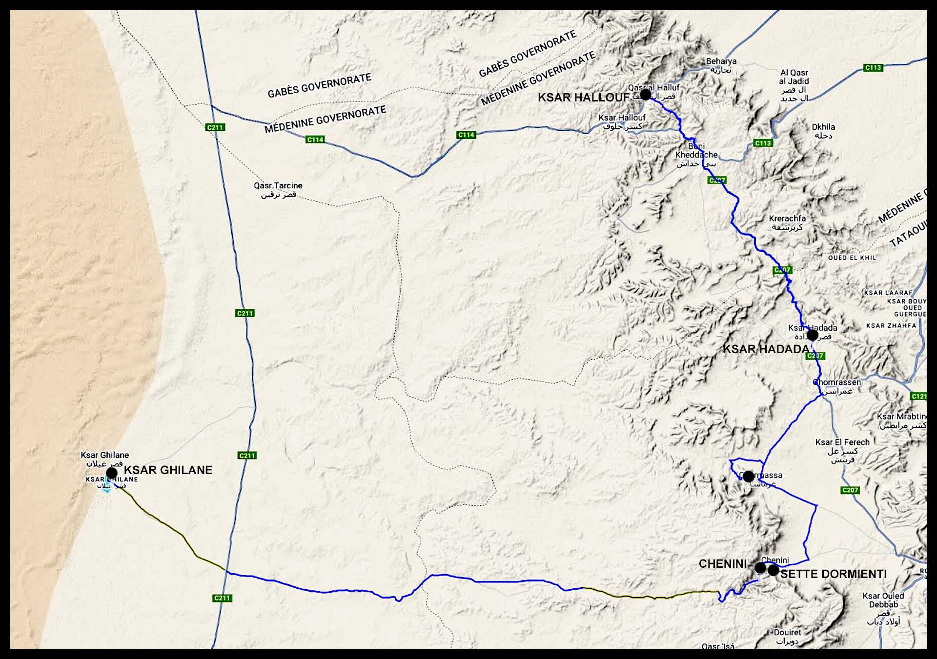 Dalla pipeline a Chenini la distanza è di circa 55 km, così suddivisa: i primi 34 km sono asfaltati, i successivi 13 sono sterrati, gli ultimi 8 sono di nuovo asfaltati. Il tratto sterrato inizia esattamente qui.