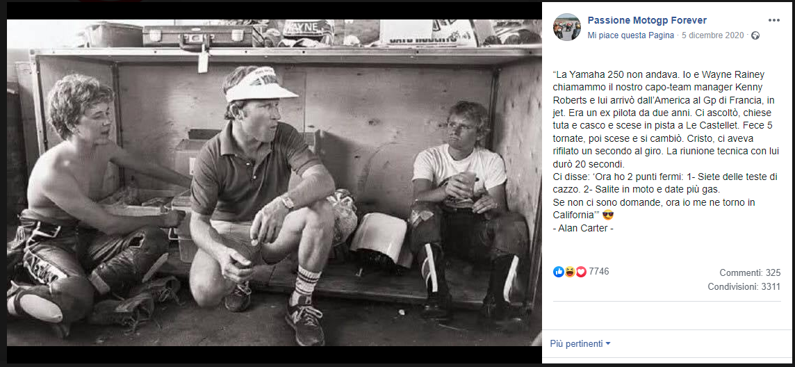 Ma la ritrovo, mi ci metto nella pausa estiva perchè meritava. tra le altre cose raccontava anche questa, che comunque era stata riportata anche da Lucky. Marco aveva legato moltissimo con Sheene, tanto che quest'ultimo spesso lo aiutava consigliandogli la gomma giusta per la gara. In un'occasione tra l'altro, proprio grazie al consiglio di Barry Lucchinelli cambiò la gomma posteriore appena prima del via e vinse la gara, battendo proprio Sheene, che non solo non se la prese, ma fu sinceramente contento per l'amico. Altri tempi.