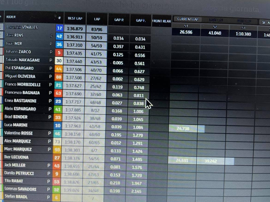 Non ci sono grandi novità se non il nuovo miglior riferimento tornato nelle mani di Vinales con 1.36.876. Maverick ha percorso quasi un centinaio di giri oggi.