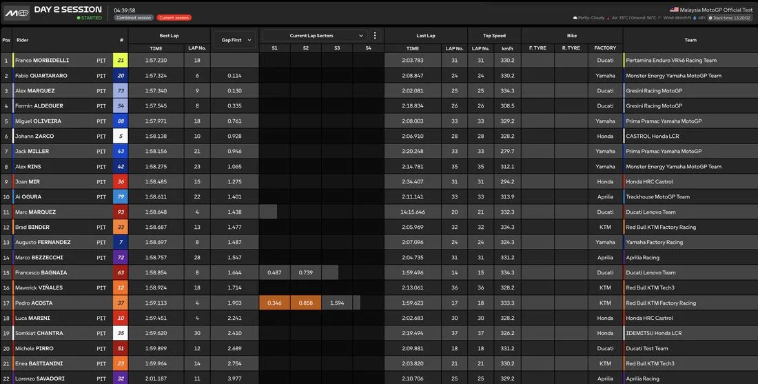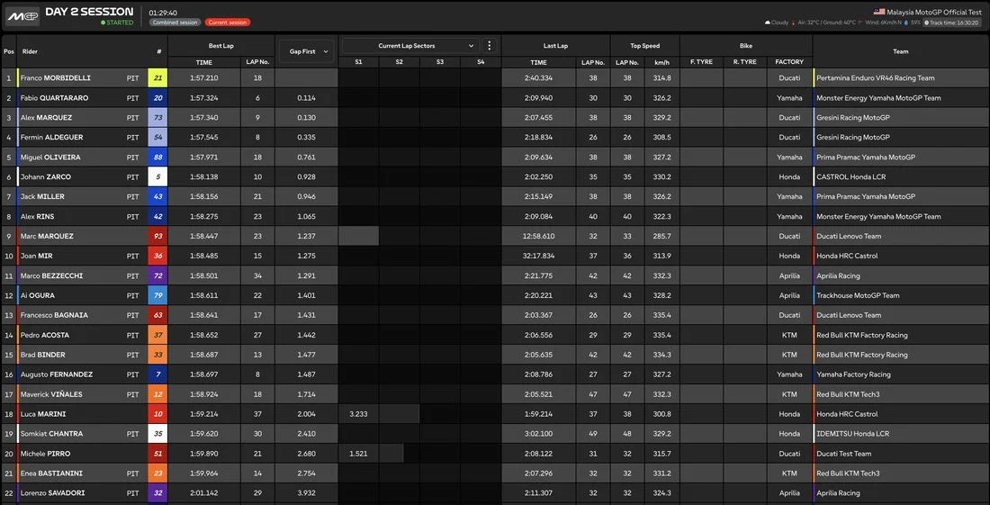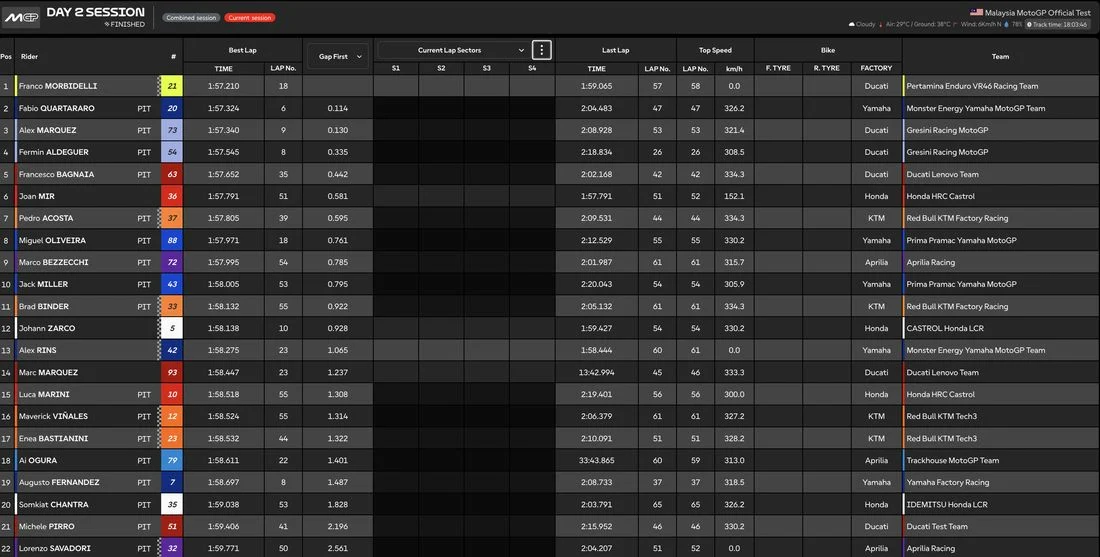 MotoGP - Test Sepang Day2 - I tempi a fine giornata