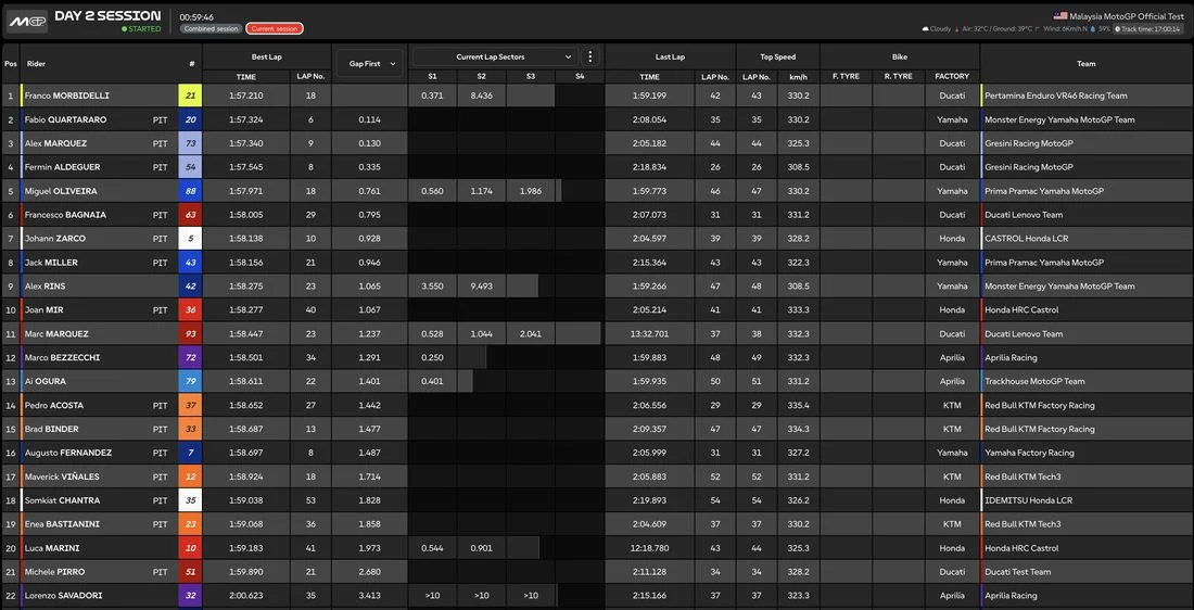 MotoGP - Test Sepang Day2 - I tempi alle 17.00