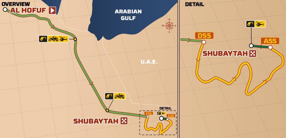 Una giornata che si presenta semplice sulla carta, ma che presenta due insidie. La prima è quella legata al lunghissimo trasferimento iniziale, che obbliga i concorrenti a prendere il via molto presto, con il freddo e la stanchezza che potrebbero avere il loro peso durante la Speciale. La seconda difficoltà è rappresentata da quello che sarà il primo contatto con le dune dell'Empty Quarter, con l'oceano di sabbia che obbligherà a velocità medie molto basse. Secondo gli organizzatori, pochi piloti riusciranno ad arrivare al bivacco prima del tramonto.