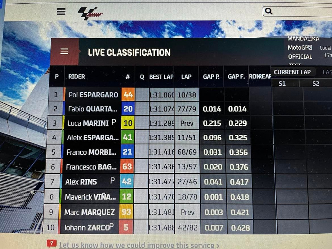 10.00 Conclusa la seconda giornata di test a Mandalika, Marini chiude col nuovo riferimento. Domani, meteo permettendo, penso si possa scendere sotto 1.31, la pista oggi pur migliorata non era ancora in condizioni ottimali.