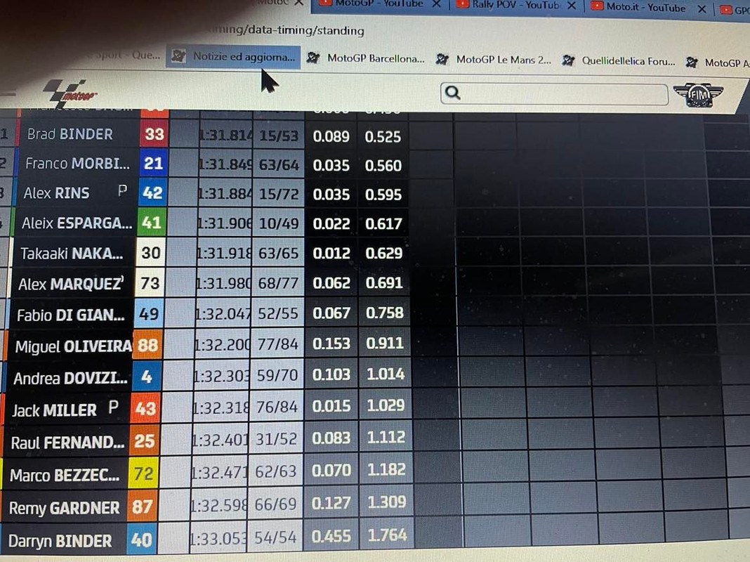 09.55 Siamo quasi alla bandiera a scacchi, miglioramento di Quartararo che resta secondo ma si porta a soli 14 millesimi da Pol Espargaro. Giro veloce anche per Morbidelli che sale al quinto posto.