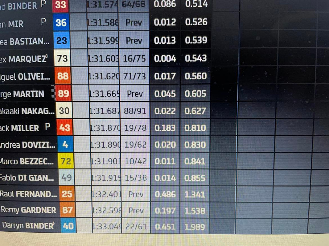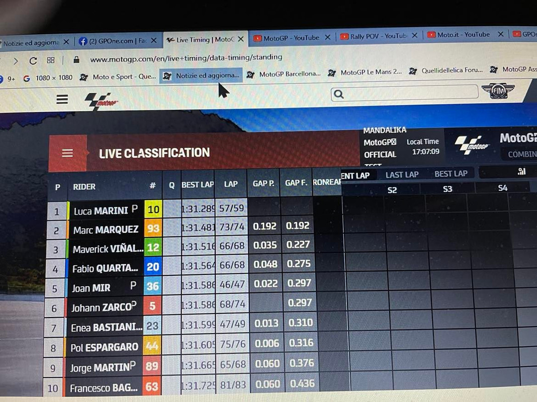 09.40 Tempone di Luca Marini, 1.31.289, è primo. Seguono Quartararo,Marquez, Zarco, Pol Espargaro, Martin e Bagnaia.
