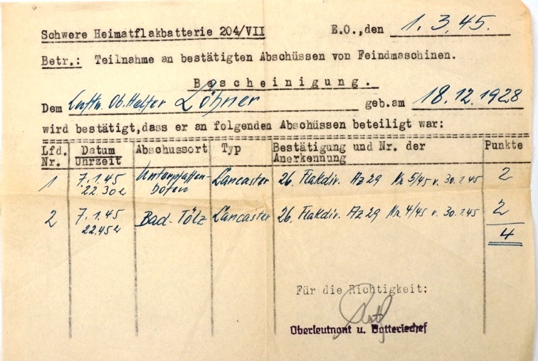 Oltre al diario, l'attestazione dell'abbattimento di due Lancaster la sera del 7 gennaio '45, facenti parte dei 650 bombardieri che seppelliscono Monaco sotto 2200 tonnellate di bombe.