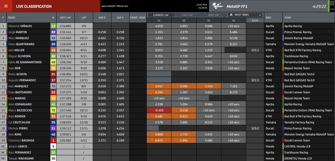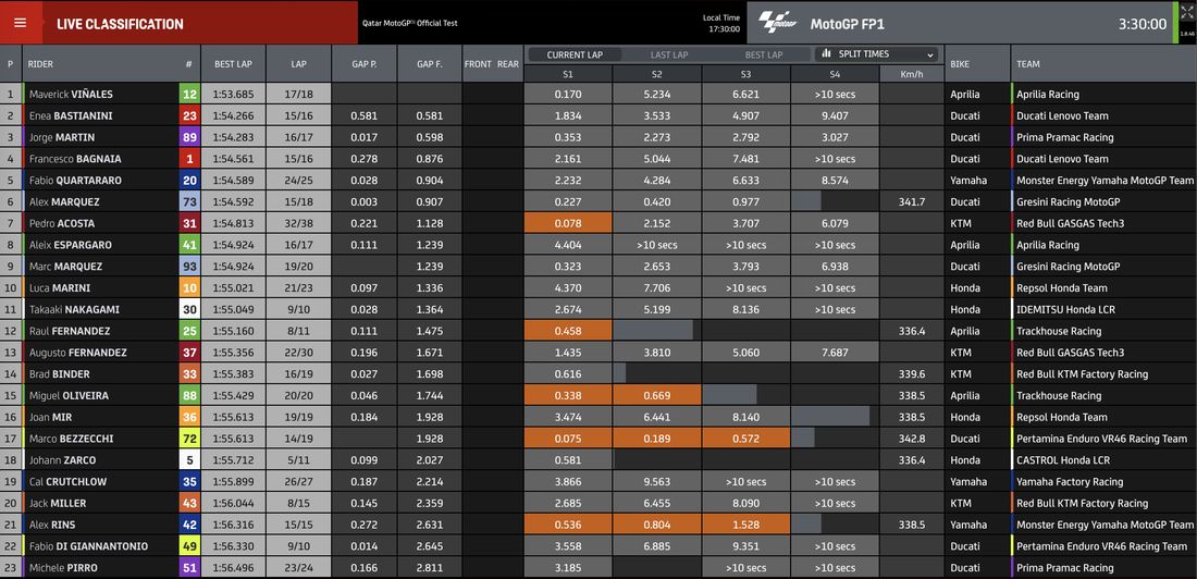 MotoGP - Test Losail Day1 - I tempi alle 15.30
