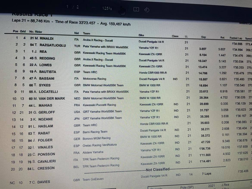 Appena concluso il warmup con Rinaldi che ha fatto segnare uh incredibile 1.33.774.lasciando Redding a sette decimi. Terzo Razgatioglu e quarto Rea staccato di oltre un secondo. Seguono Lowes, Gerloff, Haslam, Vab Der Mark e Davies, staccato di 1.3 secondi. Diciamo che sono tutti vicini a parte Rinaldi che qui fa un altro mestiere- Il nuovo asfalto ha fsicuramente avorito il miglioramento dei tempi ma il discorso vale per tutti i piloti.