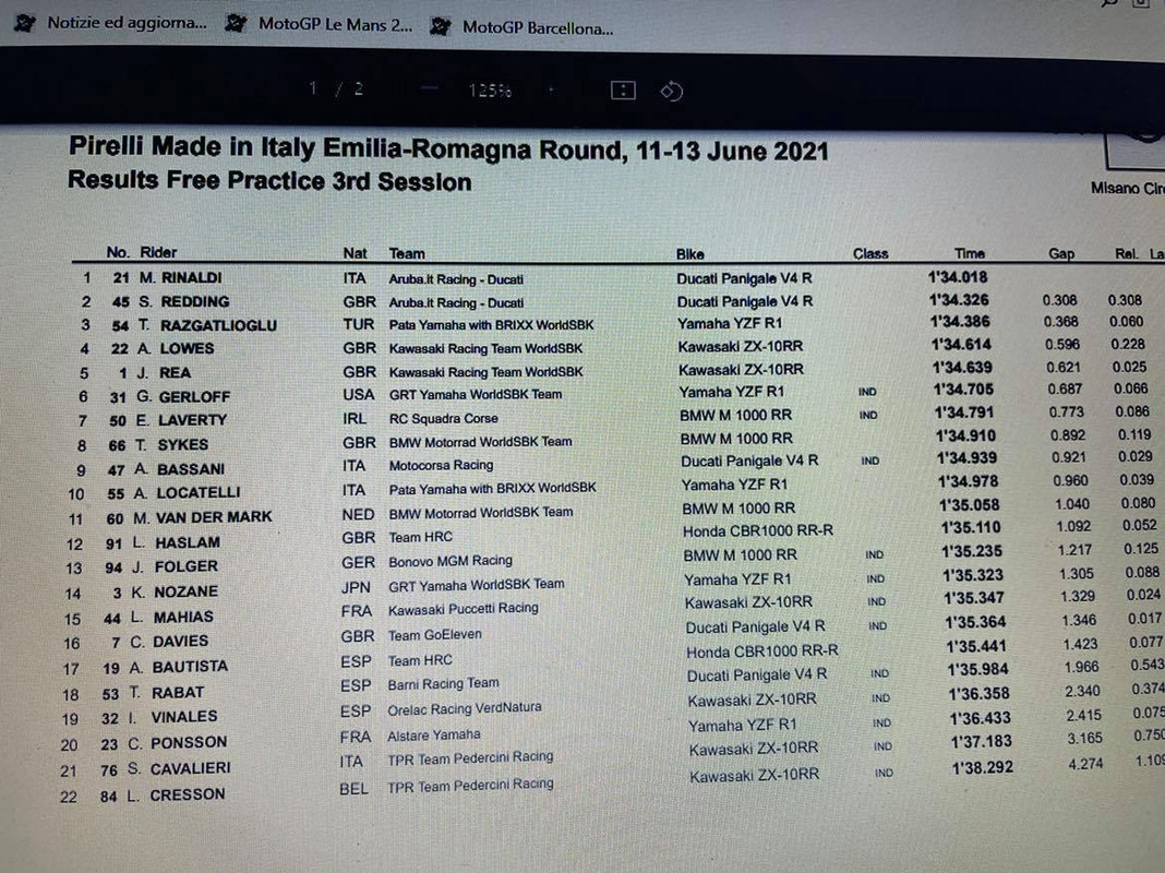 Rinaldi si conferma il più veloce anche nella terza sessione col crono di 1.34.018, Redding è secondo a tre decimi e precede di un soffio Razgatioglu. Seguono Lowes, Rea, Gerloff, Laverty, Sykes, Bassani e Locatelli.