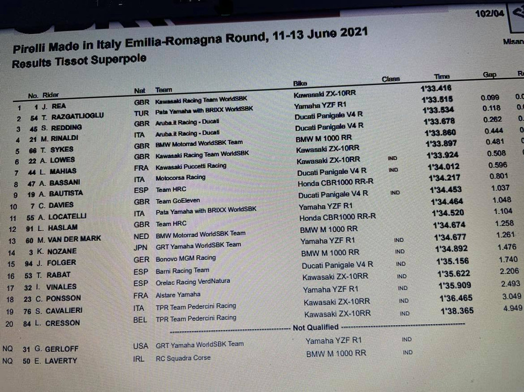 Quando si tratta di fare sul serio Rea viene sempre fuori. Razgatioglu e Redding completano la prima fila mentre Rinaldi quarto precede Sykes e Lowes.