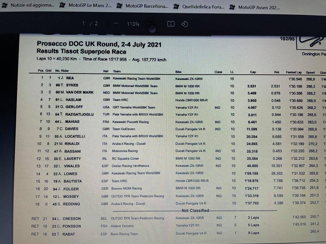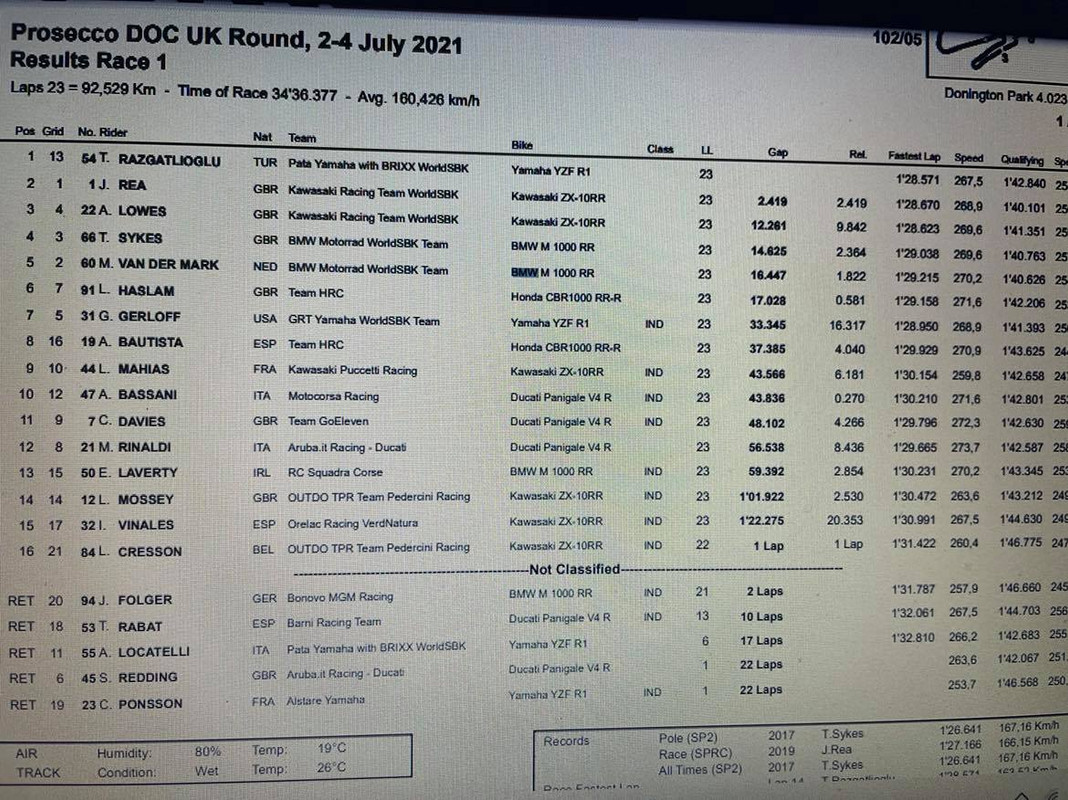 Pista ancora bagnata ed in queste condizioni Rea risulta imprendibile. Bene le BMW che completano la prima fila con Van Der Mark e Sykes nell'ordine. Prima Ducati quella di Redding, sesto alle spalle di Lowes e Gerloff ma che incassa un distacco abissale. Il bagnato si conferma il vero punto debole di Razgatioglu che chiude solo tredicesimo.