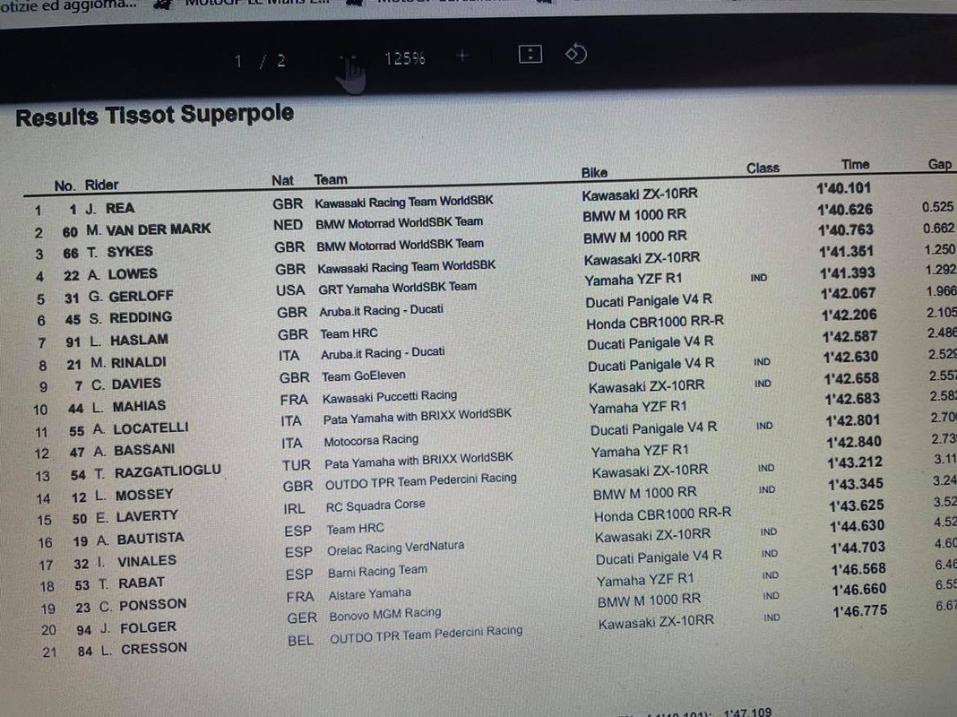 Appena concluso il Warmup, ancora all'insegna del confronto tra il campione del mondo e Razgatioglu. Rea ha fatto segnare il miglior crono col tempo di 1.27.904 staccando di poco più di un decimo Toprak con Gerloff terzo ed anche lui molto vicino. Quarto Redding a quattro decimi che precede Lowea, Sykes, Haslam e Rinadli, quest0ultimo staccato di poco più di sette decimi.