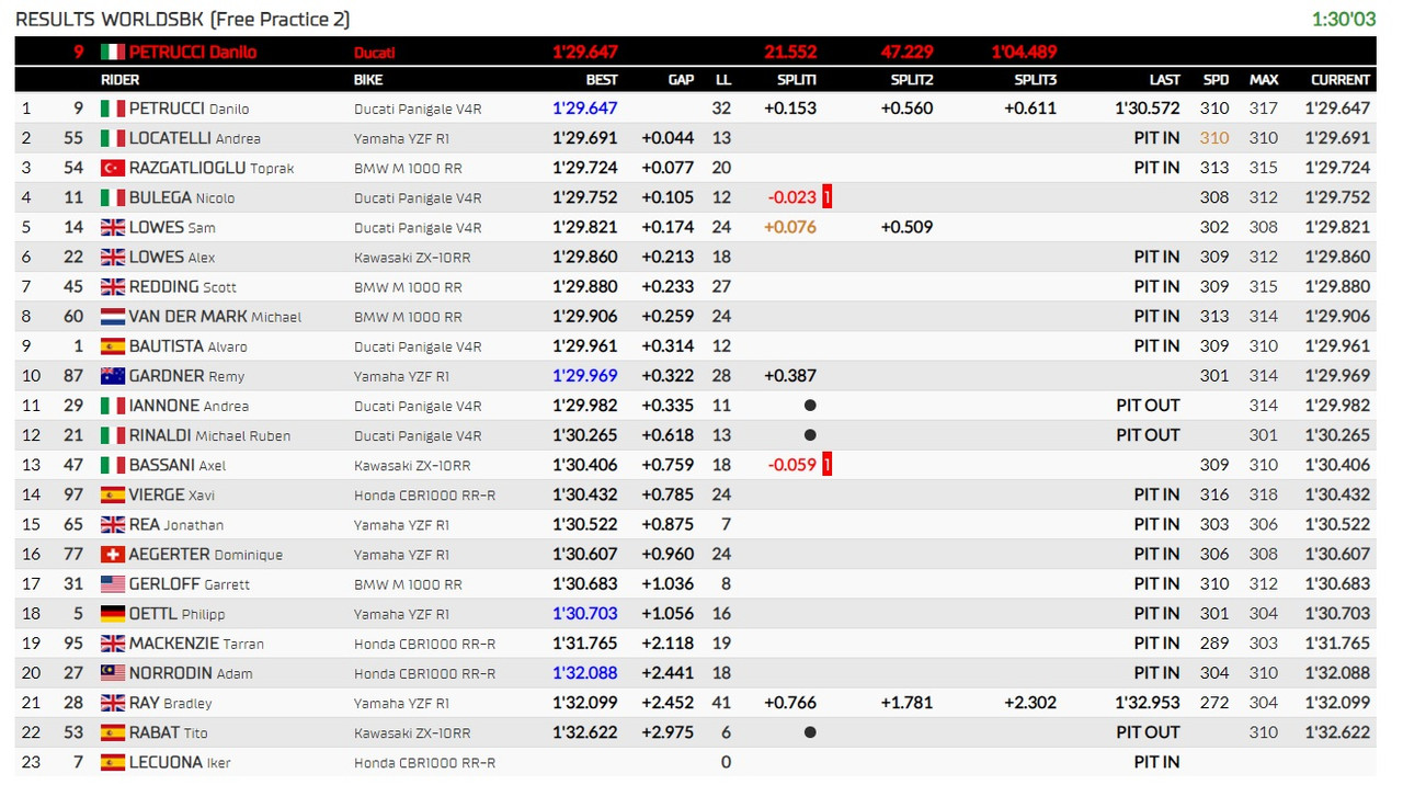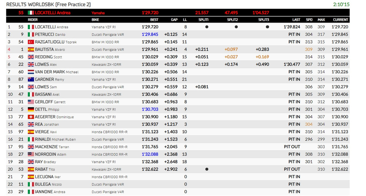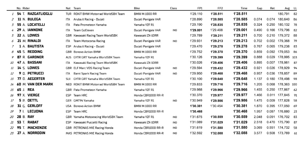 Razgatioglu chiude strappando a Bulega il primato della pista per soli 4 millesimi! Molto bene Locatelli e stupisce Iannone, che qui comunque è sempre andato fortissimo.