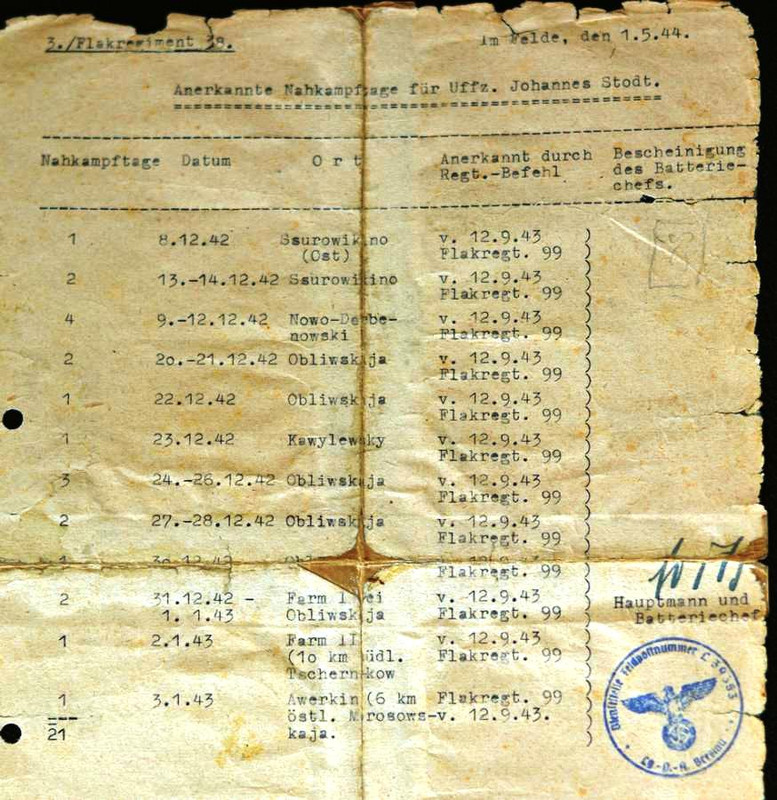 Qui un documento che ci mostra la ferocia dei combattimenti che sostiene a Stalingrado: la sua batteria respinge ben 21 attacchi ravvicinati in meno di un mese alla difesa dell'aereoporto di Obliwskaja, importantissimo punto da cui partono i rifornimenti per le truppe bloccate nella città