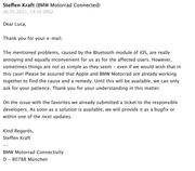 The mentioned problems, caused by the Bluetooth module of iOS, are really annoying and equally inconvenient for us as for the affected users. However, sometimes things are not as simple as they seem - even if we would wish that in this case! Please be assured that Apple and BMW Motorrad are already working together to find the cause and a remedy. Until this will be available, we can only ask for your patience. Thank you for your understanding in this matter.