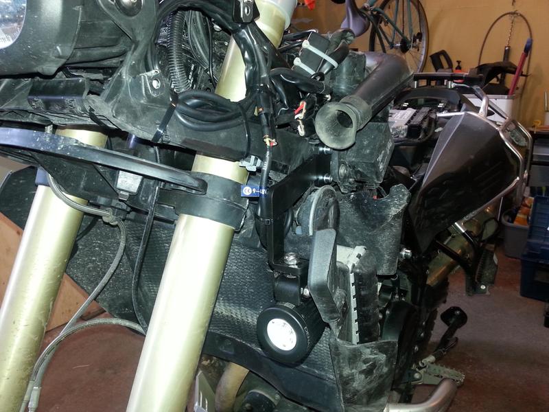 Per i faretti ho cercato i più piccoli e robusti in circolazione per via delle cadute possibili: non volevo montarli sui tubolari paramotore (che prendono botte in continuazione), non vicino al radiatore ( che riceve mitragliate di sassi e fango dalla gomma anteriore) e soprattutto montati non con staffe rigide da 3/4 mm. che farebbero più danni a tutto quello che c'è intorno in caso di appoggio. Per cui ho utilizzato una semplice piattina in acciaio da 2 mm. larga circa 4 cm che avvolge l'arco in plastica che regge il becco, stretta solo da una vite + dado autobloccante che porta il faretto. Il tutto è libero di "vibrare" liberamente (molto utile in off sui fondi sconnessi) e soprattutto abbastanza elastico da piegarsi leggermente in caso di appoggio senza compromettere la tenuta dei faretti o la struttura dell'arco.