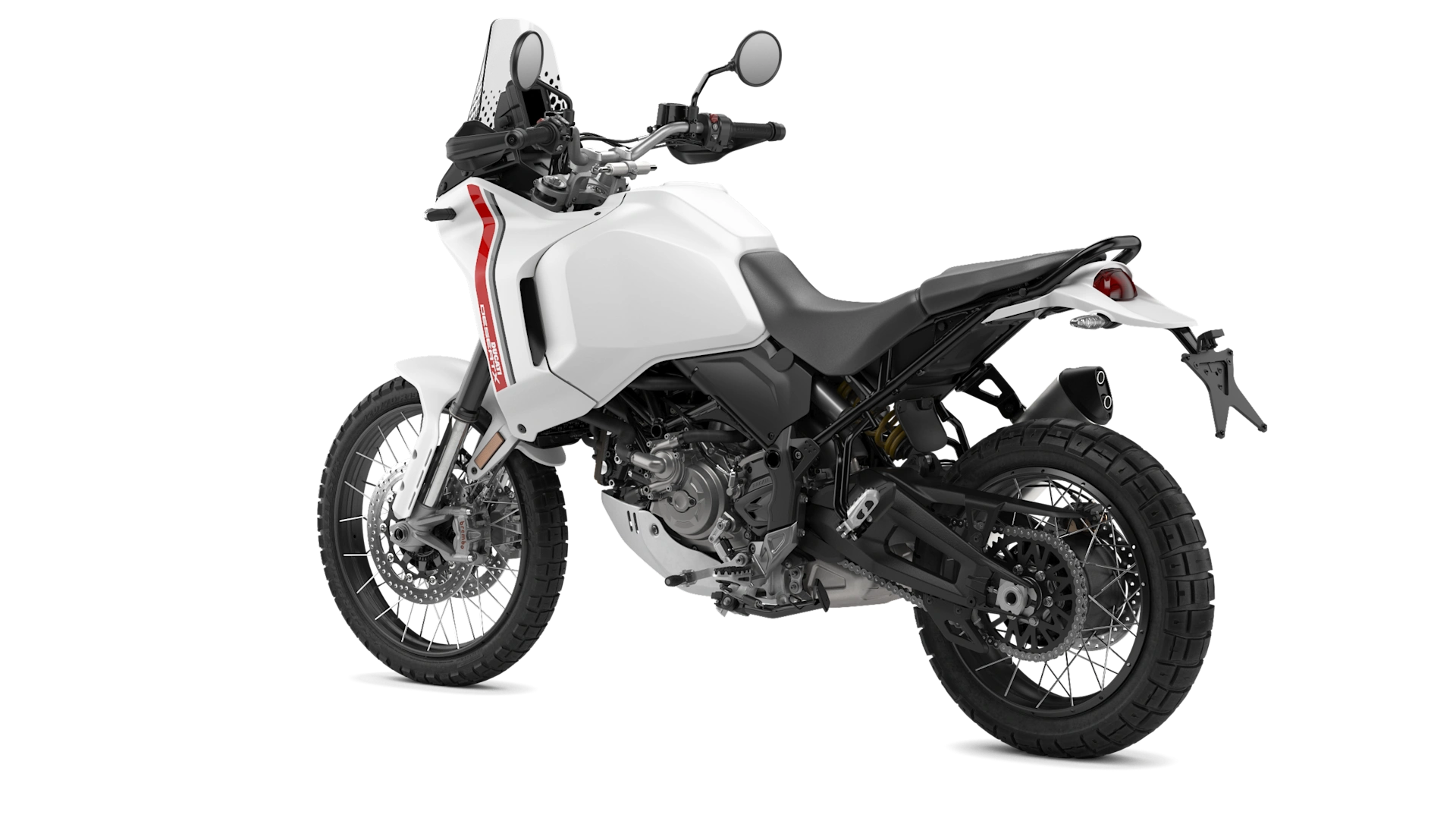 Motore a L con cilindro orizzontale che limita escursione anteriore a meno di aprire il cannotto e/o riduce la possibilità di allungare il forcellone a parità di passo. Baricentro alto, presa d’aria delle cinghie distribuzione ducati proprio lì davanti ad aspirare detriti vari.