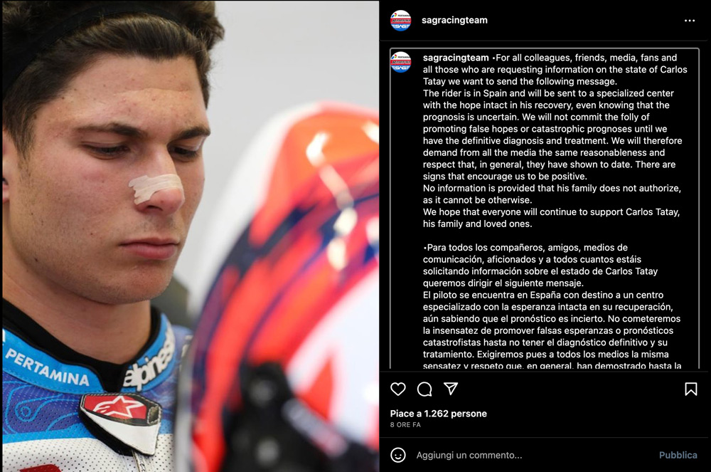 Dopo l' incidente nel corso della prova di Campionato Europeo Moto2 a Portimao, il pilota spagnolo era stato operato d'urgenza all'ospedale di Faro, per via delle gravi lesioni vertebrali riportate. Ora ha fatto rientro in Spagna ed è ricoverato in un centro specializzato in questo genere di traumi. Ancora non ci sono certezze sulla prognosi e sulla possibilità di recupero, le uniche notizie sono quelle riportate dalla sua squadra.