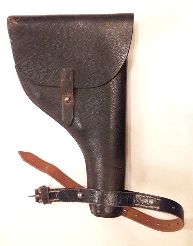 Pesantemente usata ma ancora in ottime condizioni, morbidissima e completa di tutte le cuciture e di tutte le sue parti: cinghietto e fibbia di chiusura, tasca portacaricatore, passanti posteriori, taschino interno per la chiavetta di smontaggio, estrattore.