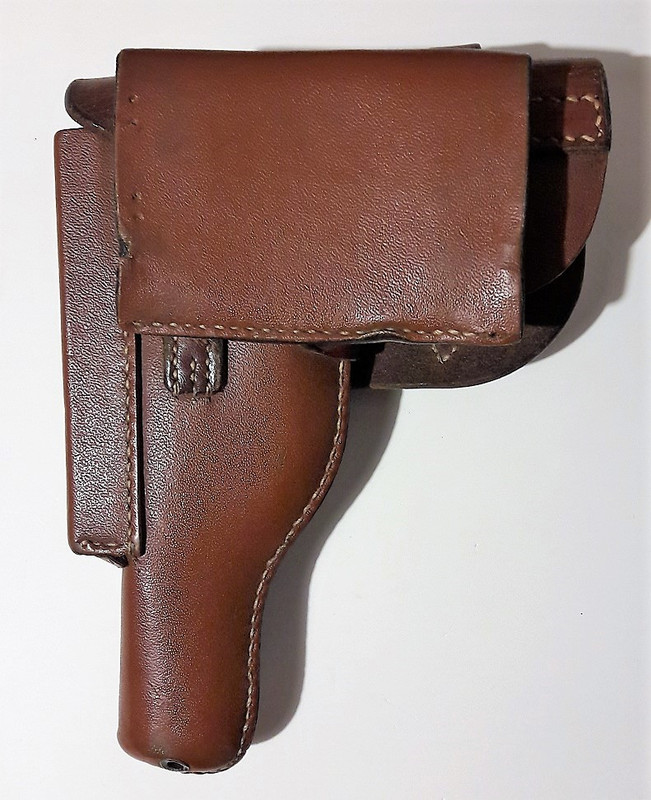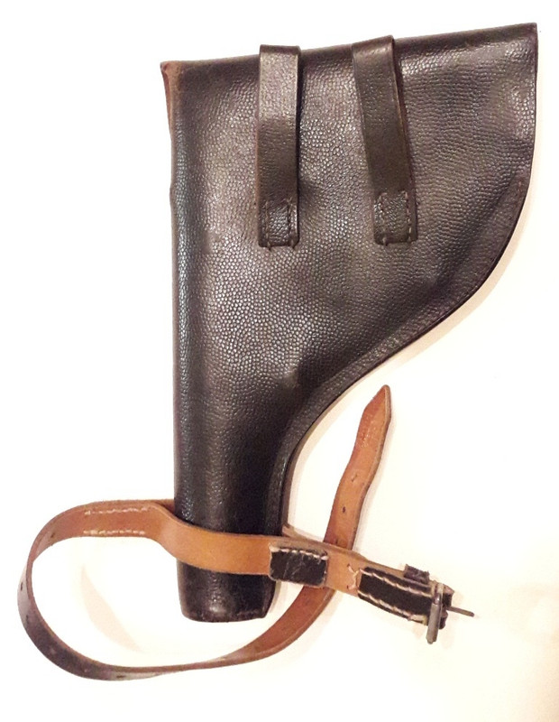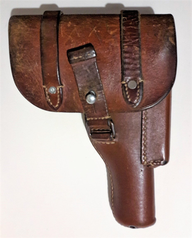 Come descrizione sommaria possiamo dire si tratta di fondina “Akah” per pistola d’ordinanza Walther PP, in cuoio prodotta dalla rinomata ditta Albrecht Kind di Husting e riconoscibile per il punzone con i fucili incrociati sulla patta di estrazione rapida, sovrastato dal marchio del brevetto statale D.R.G.M.