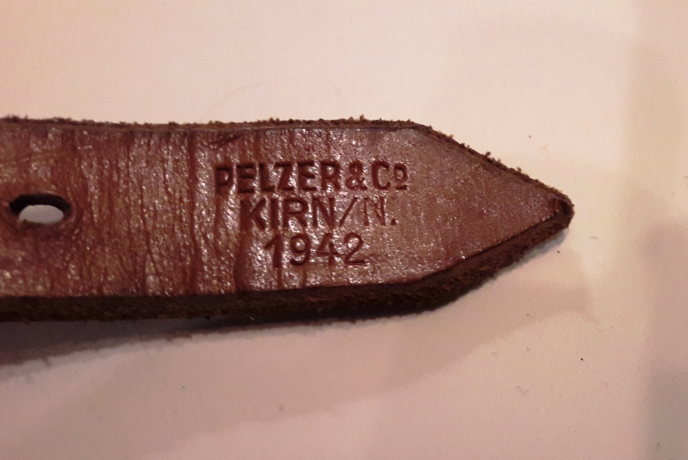 Alla gamba della fondina, cinturino con riporto a sgancio rapido per l’allacciamento allo stivale, produttore “ Pelzer & Co.” di Kirn (Renania-Palatinato), datata 1942.