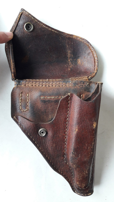 In pelle di maiale, patta di chiusura con bottone automatico in ottone, tasca per caricatore di scorta sulla parte anteriore. Al retro un passante grande per il cinturone da campo e due patte con anelli in acciaio verniciato per la cinghia a tracolla. Non sono presenti contrassegni o scritte. In ottime condizioni.