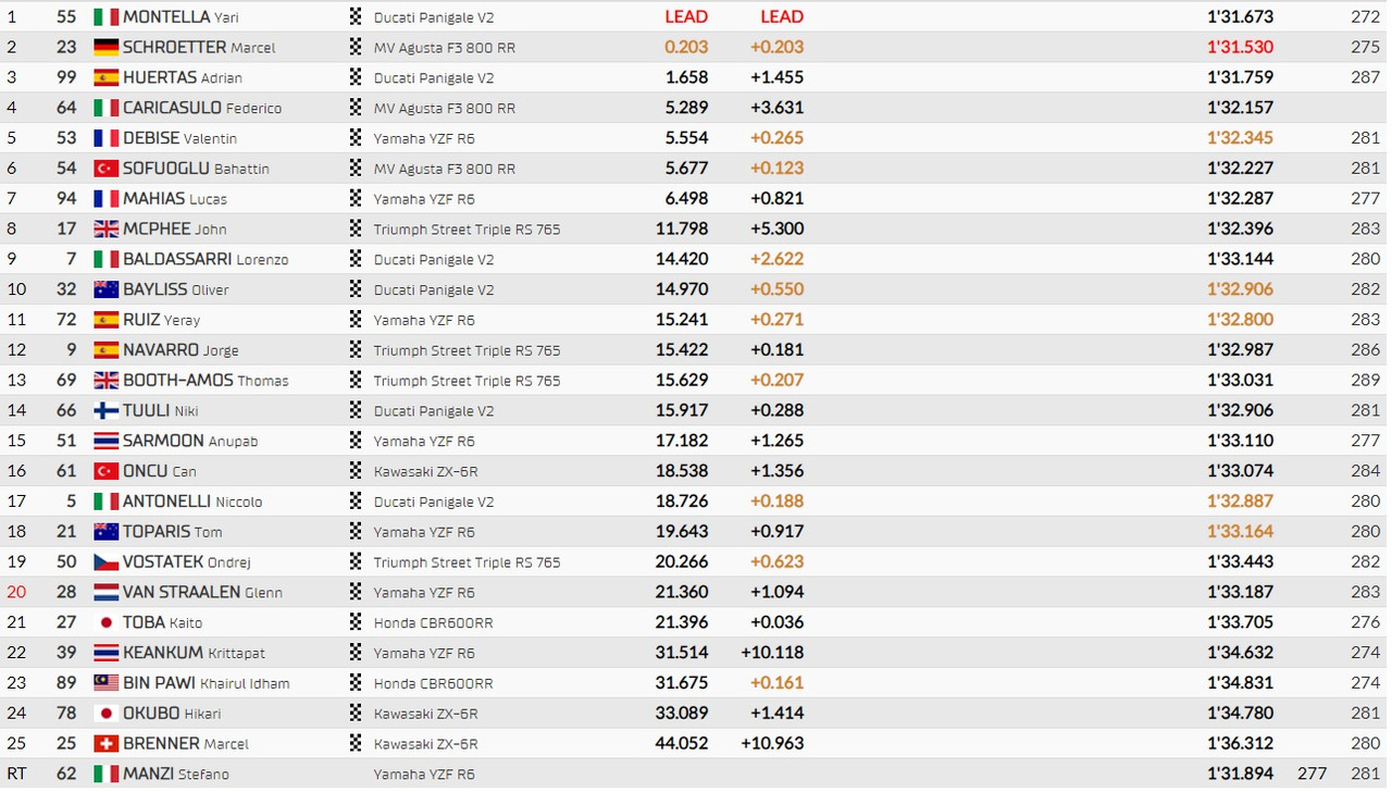 In SSP tanta confusione, tutti troppo carichi? La MV con Sofuogli pizzicati con la pressione sbagliata (chiude bene ma più per demerito dei rivali), Huertas e Aruba.it con noie tecniche anche grazie al fatto che lo spagnolo è veloce ma affine alla ghiaia, il ritorno di Oncu dopo l'operazione travagliata che dura due curve, un jump-start per il dominatore Yari Montella che non ho ancora capito come non sia stato penalizzato... Di ogni.