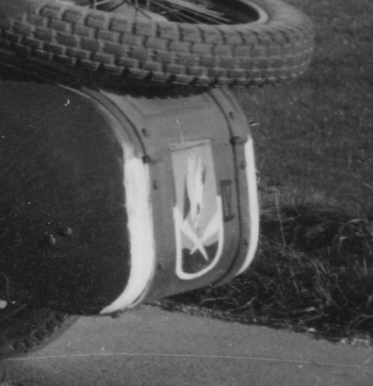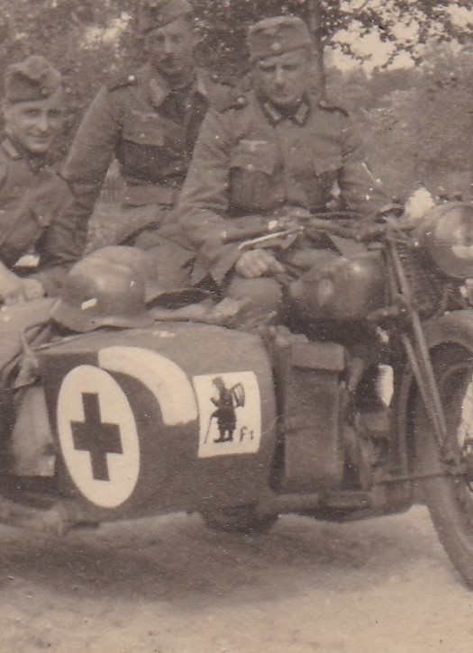 Una foto doppiamente interessante: il retro di un sidecar ci mostra non solo il famoso emblema dei reparti da caccia notturna, ma anche l'aggiunta di due fasci di riflettori antiaerei