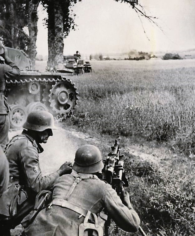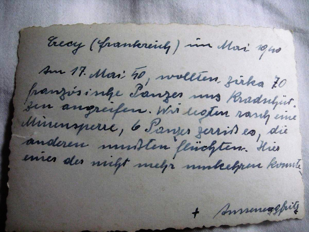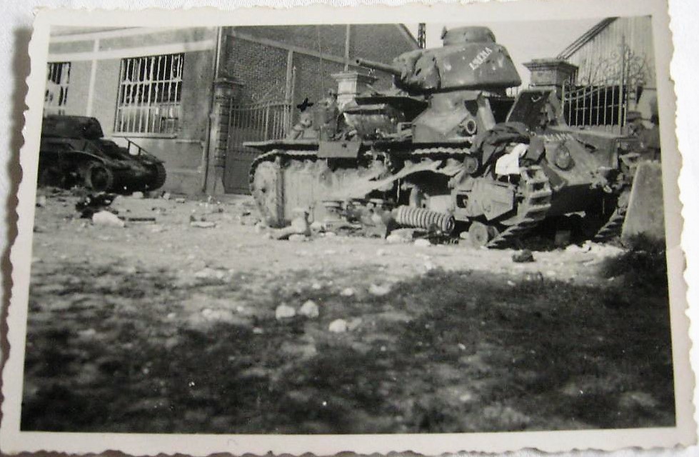 Il 17 maggio 1940, circa 70 carri armati francesi hanno cercato di attaccare le nostre truppe motociclistiche. Abbiamo rapidamente posato una barriera di mine; 6 carri armati sono stati fatti saltare in aria, gli altri sono dovuti fuggire. Eccone uno che non è stato in grado di tornare indietro".