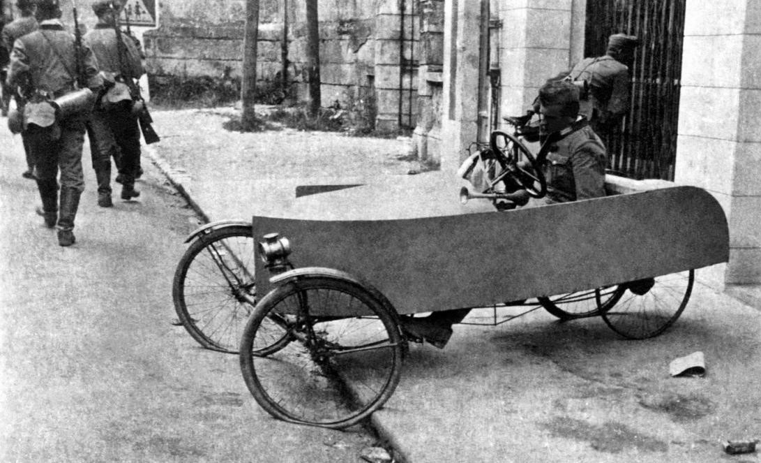 Civili in fuga su una Velocar a pedali, Francia 1940