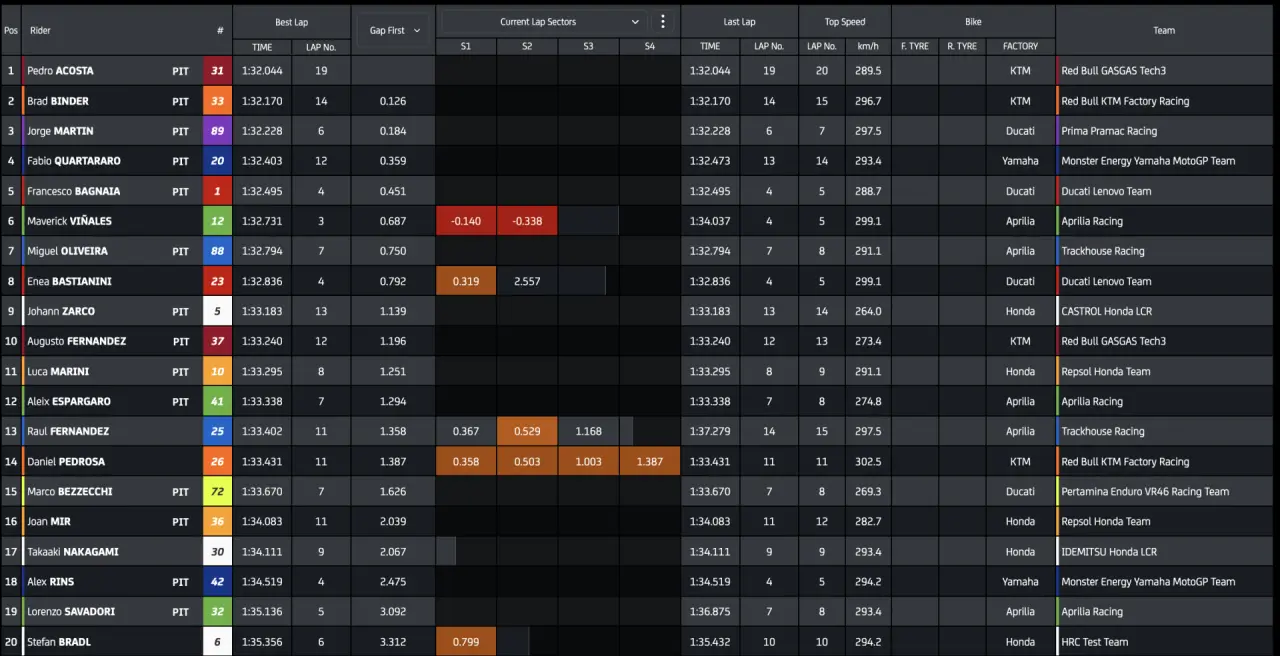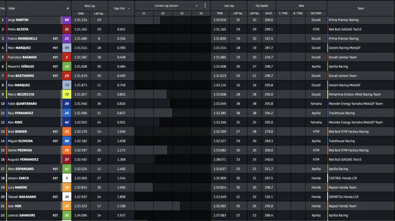 17 31 Pedro ACOSTA SPA Red Bull GASGAS Tech3 KTM 42'24.712 155.4 1 lap