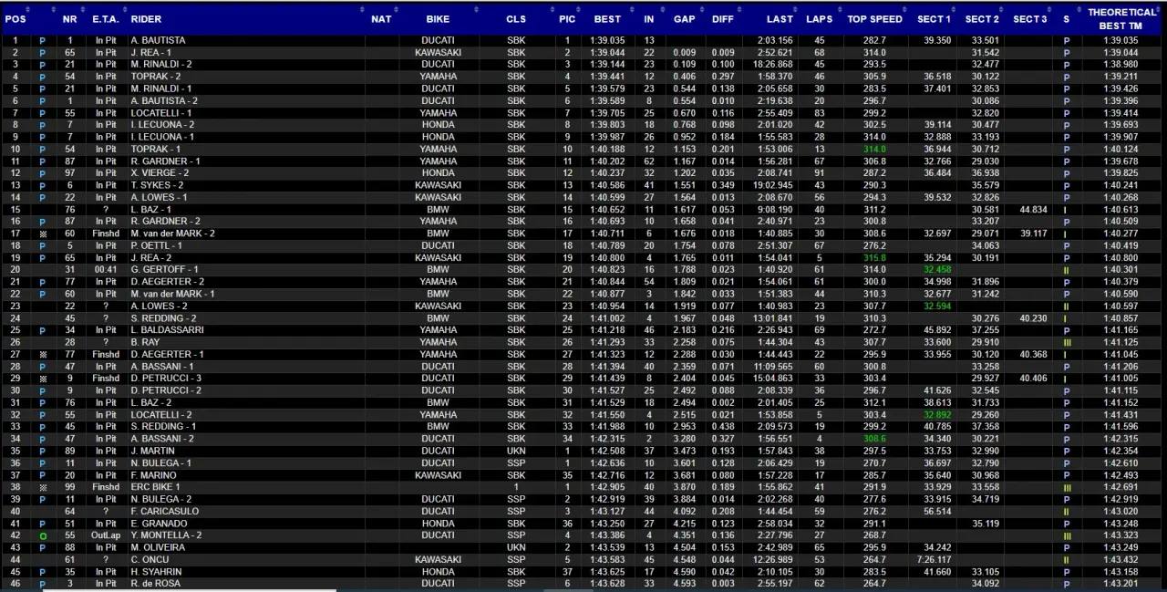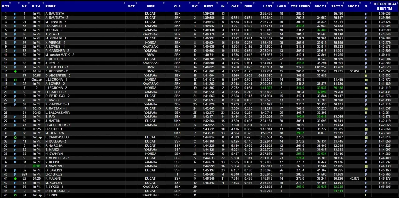 Conclusa anche la due giorni di Portimao. Bautista chiude davanti a tutti siglando il nuovo primato della pista, con Rea ad un soffio. Tempi da MotoGP (Bagnaia 1.38.725, 2021), ma sicuramente hanno utilizzato gomme da tempo. Va detto poi che Portimao, per le sue caratteristiche particolari, è una delle pista in cui per le MotogP è più difficile fare la differenza.