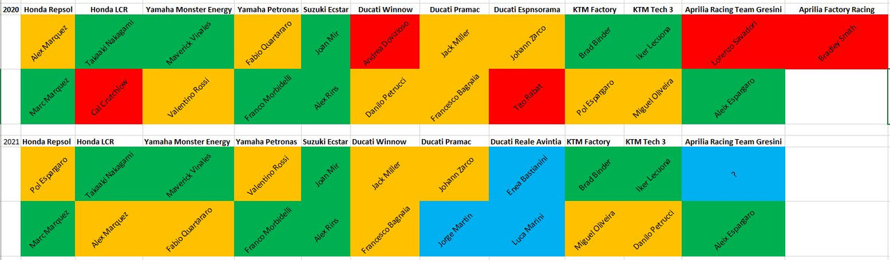 E provando a far tornare le caselle tra piloti che nel 2021 rimarranno dove sono stati nel 2020, in VERDE, piloti che cambieranno team, in GIALLO, piloti che abbandoneranno, in ROSSO, e piloti che arriveranno nel 2021, in AZZURRO, vi sottopongo alcuni ragionamenti ed un dubbio.
