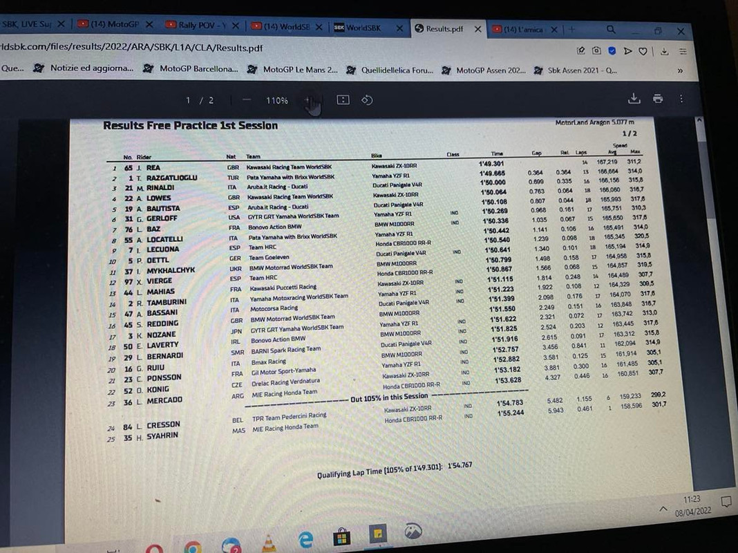 Proprio a fine turno Razgatioglu piazza il time attack e si inserisce al secondo posto tra le due kawasaki, ma Rea resta inavvicinabile, quasi quattro decimi il suo margine. Seguono Razgatioglu, Rinaldi, Lowes,Bautista, Gerloff e Baz. |