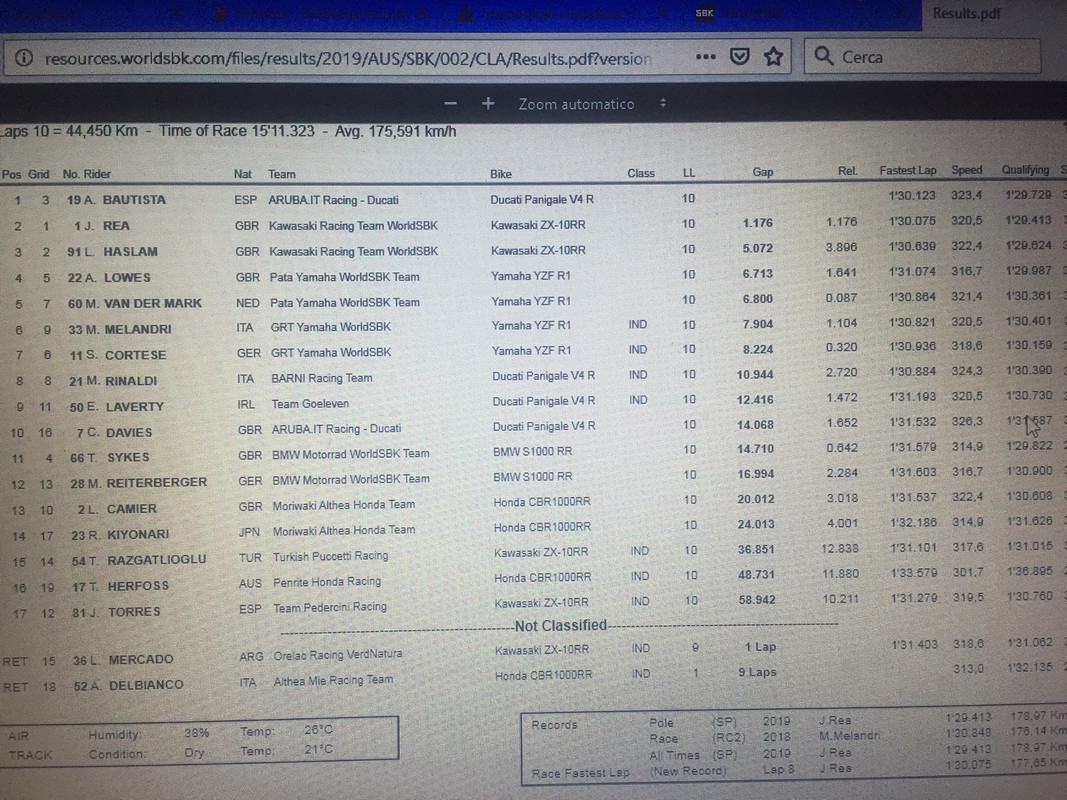 Bautista stravince CON 12 secondi di vantaggio su Rea, Haslam chiude il podio. Poi le yamaha di VD Mark, Melandri e Lowes. Alvaro fa bottino pieno, 3 vittorie e 62 punti a Philip Island. In Gara 2 al penultimo giro aveva oltre 18 secondi di margine, ha fatto l'ultimo giro a passo d'uomo. Incredibile. |