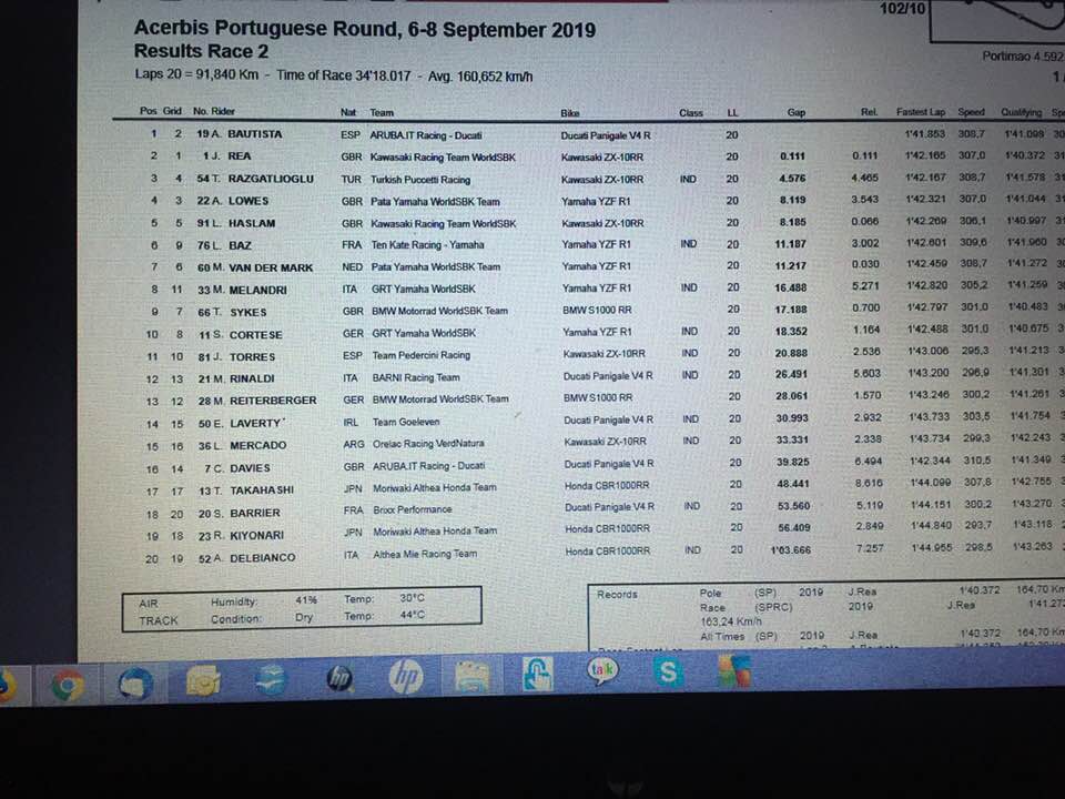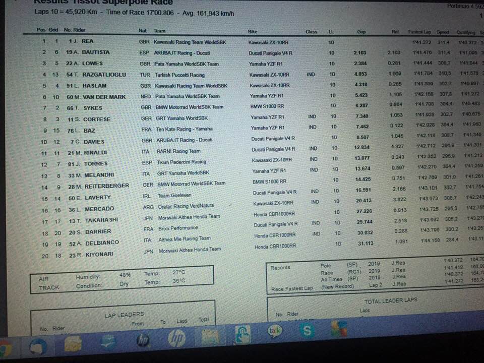 Rea vince anche la Superpole Race davanti a Bautista che chiude secondo in rimonta dopo un'altra partenza stentata. Lowes completa il podio, solo decimo Davies.