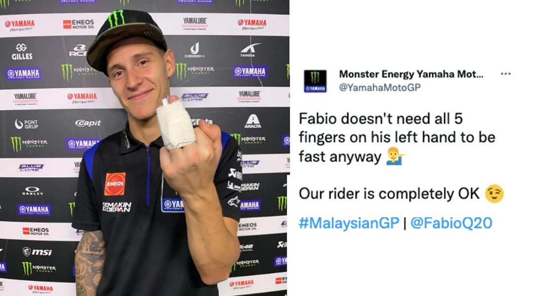 Spiegato il dolore che Fabio avvertiva, per fortuna la mano è la sinistra ma certo non sarà nelle migliori condizioni. L'infortunio è conseguenza della caduta nelle FP4 di oggi. |