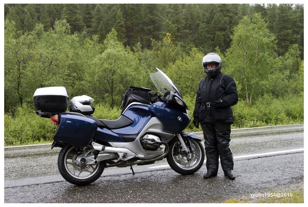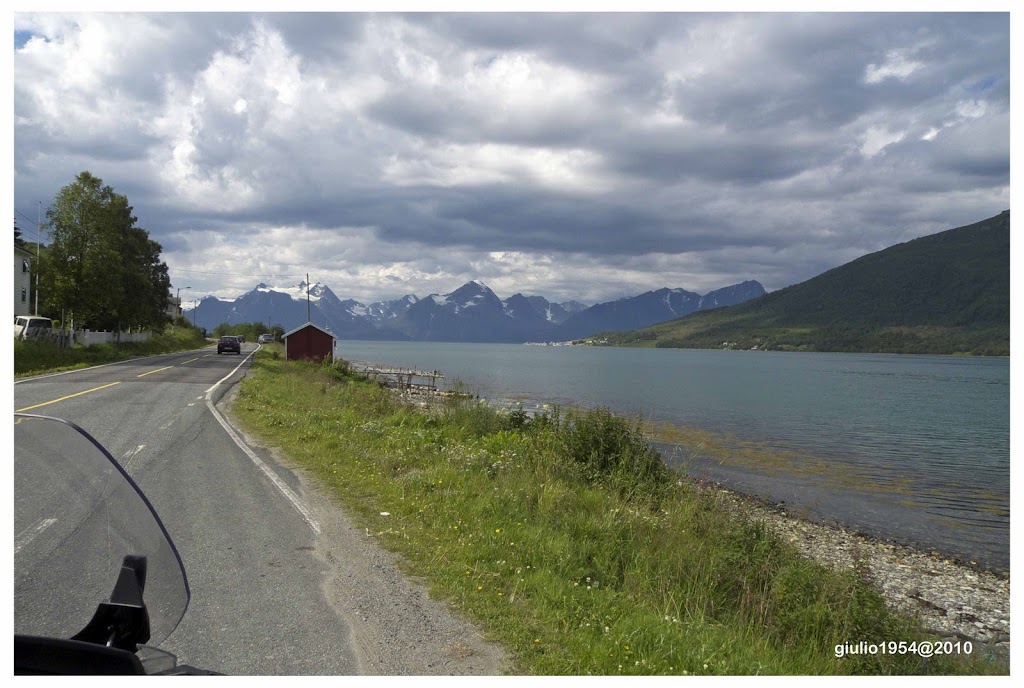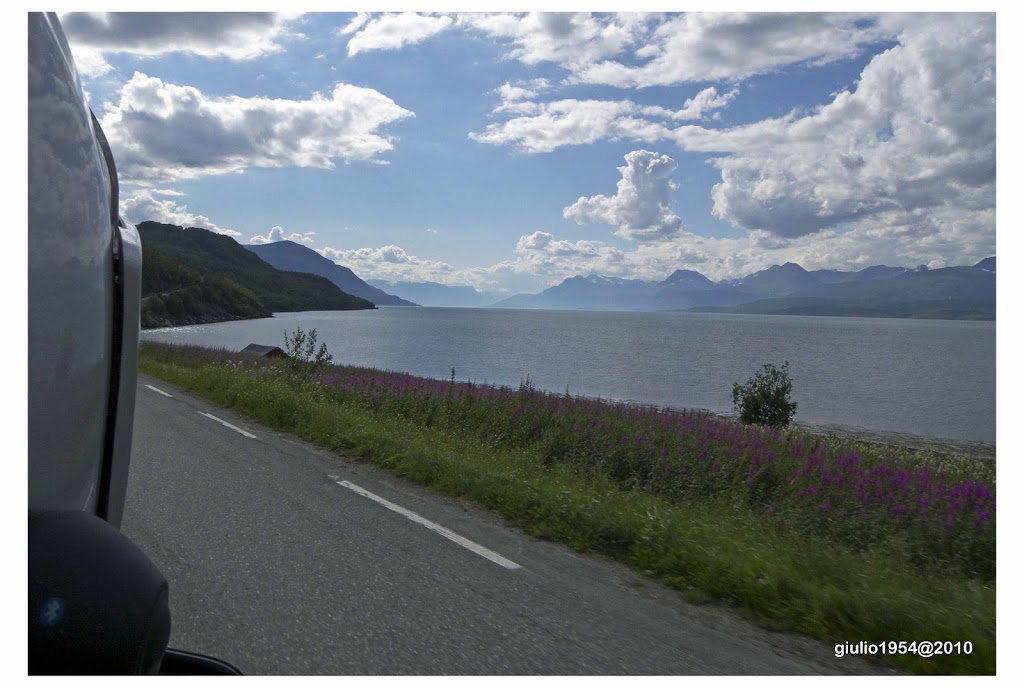 Ripercorriamo la strada di ieri con preoccupazione crescente mano a mano che i chilometri si susseguono senza l’ombra di un distributore perché non abbiamo fatto rifornimento a Honningsvag, finché poco prima di Russeness ne incontriamo uno. Mentre stiamo ripartendo, arriva un GS il cui pilota si fa riconoscere come frequentatore del forum di Mototurismo ed è un piacere scambiare due chiacchiere con lui, Gionni1964, e con sua moglie. Ci sialutiamo e a Oldsfjord riprendiamo la E6, allontanandoci dalla costa.