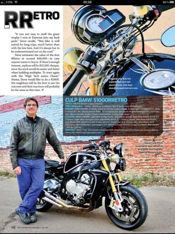 E' la replica di una delle sei moto ufficiali realizzate dalla BMW (tutte andate distrutte) che corsero la Sei Giorni di Enduro del 1979 in Germania. Tre anni di studi e ricerche per trovare i dati e le caratteristiche delle moto, e adesso la produco in piccola serie con la benedizione di Perez (l'ingegnere della BMW che la progettò e la portò in gara) e di Witzel che ci vinse la classe alla sei giorni.