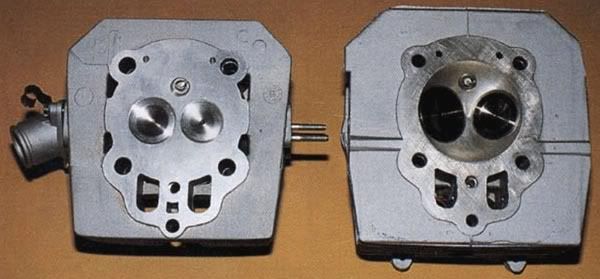 Nella foto, il confronto tra le teste del V75 a camera heron e a camera emisferica. Salta agli occhi la differente dimensione delle valvole.