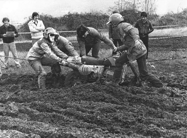 la moto nella prima foto e' un swm rotax,il che fa supporre che sia al massimo del 1977 in poi. La seconda foto a giudicare dal tachimetrone potrebbe essere una rara Ossa o Bultaco o Montesa che in variante regolarita' erano poco diffuse in italia.