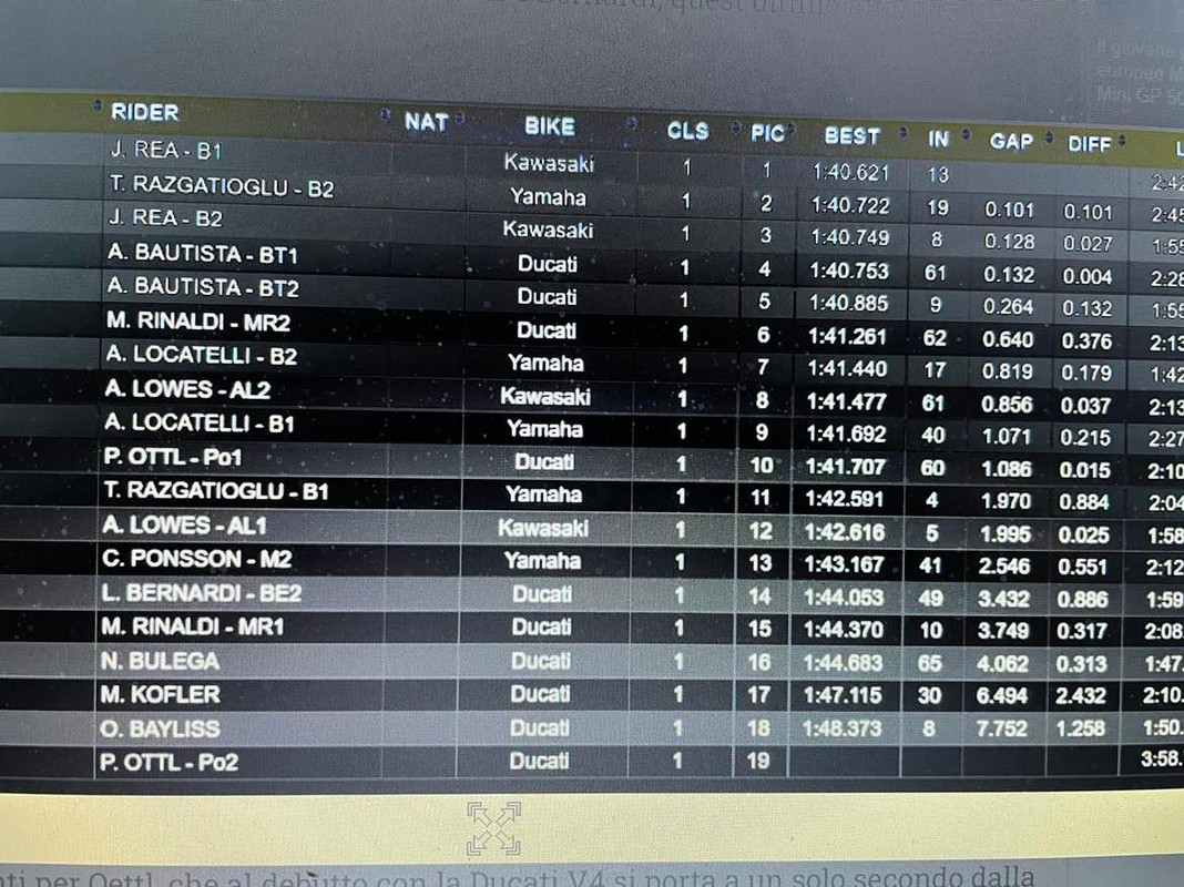A metà giornata Rea è davanti a tutti con il tempo di 1.40.068. oltre mezzo secondo sotto il riferimento fatto segnare ieri. Al secondo posto Bautista, staccato di quasi sei decimi che precede di un soffio Locatelli. Quarto Lowes e quinto Razgatioglu,staccato di un secondo da Rea.