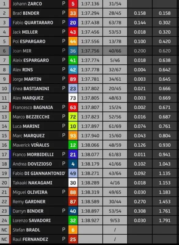 12.30 Brad Binder si porta al comando della classifica con il tempo di 1.37.294 e precede Quartararo, Pol e Aleix Espargaro, Rins, Bastianini e Bagnaia.